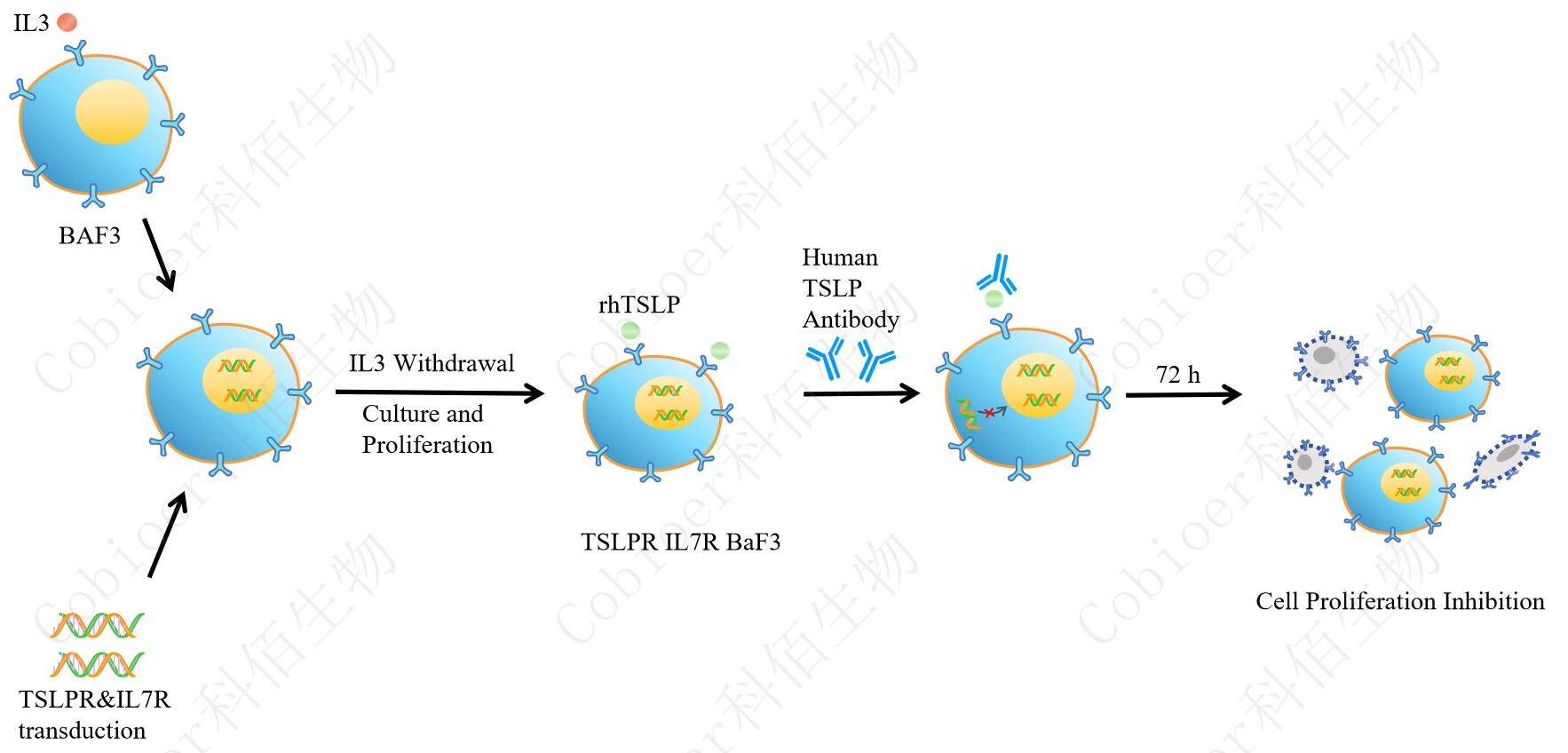 BaF3(小鼠原 B 細(xì)胞)的生長(zhǎng)和增殖需要 IL-3 的維持。通過(guò)引入各種表達(dá)激酶的基因, 能作為 BaF3 的驅(qū)動(dòng)基因,讓 BaF3 不再依賴 IL-3 而增殖,進(jìn)而激酶基因成為 BaF3 增殖依賴的驅(qū)動(dòng)基因,用于評(píng)估小分子藥物對(duì)激酶的靶向抑制作用,原理及流程見(jiàn)下圖所示。![]() Figure 1. TSLPR IL7R BaF3 細(xì)胞模型原理圖 |