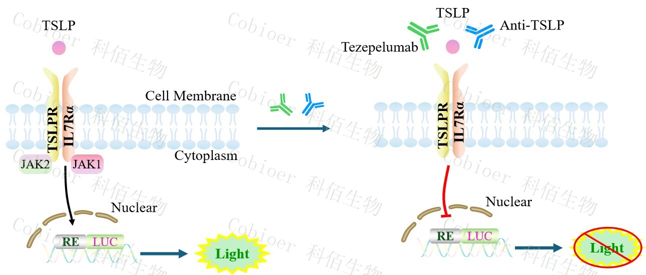 TSLP Effector Reporter Cell 報告基因藥靶模型很好的模擬了體內 TSLP 的信號轉導過程,原理見下圖所示。![]() Figure 1. TSLP Effector Reporter Cell 細胞模型原理圖 |