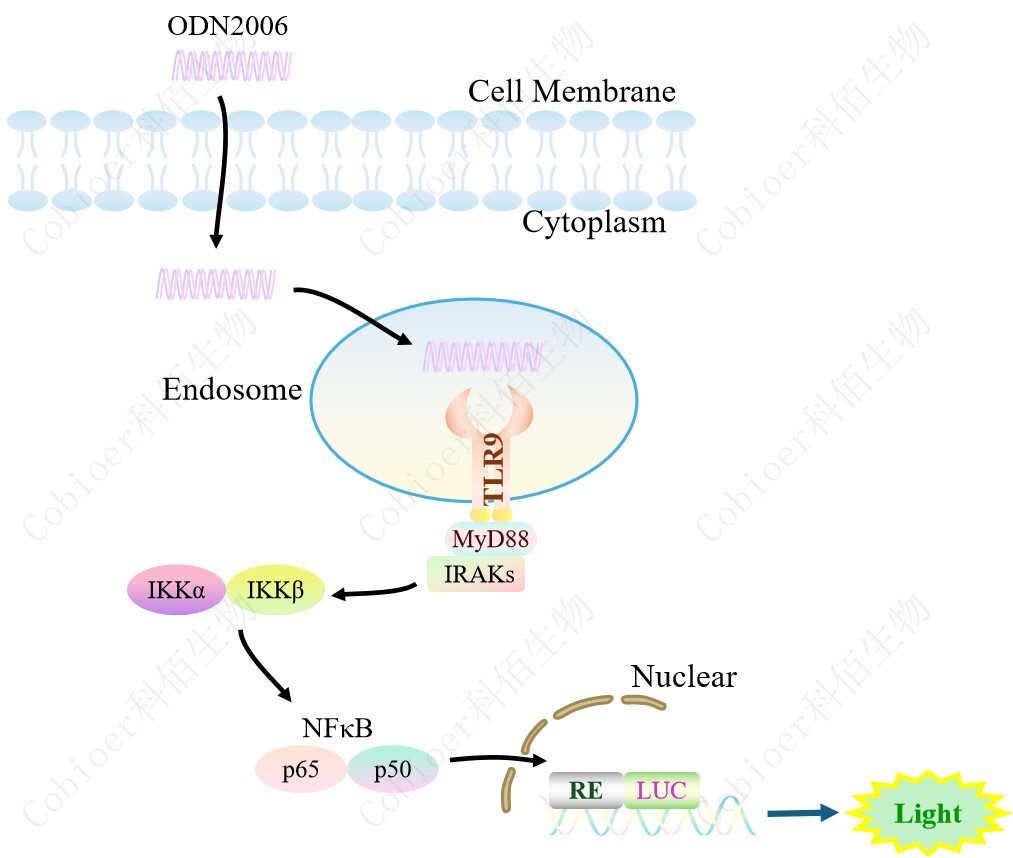 TLR9 NFκB-Luc HEK293 報告基因藥靶模型很好的模擬了體內 TLR9 的信號轉導過程, 原理見下圖所示。