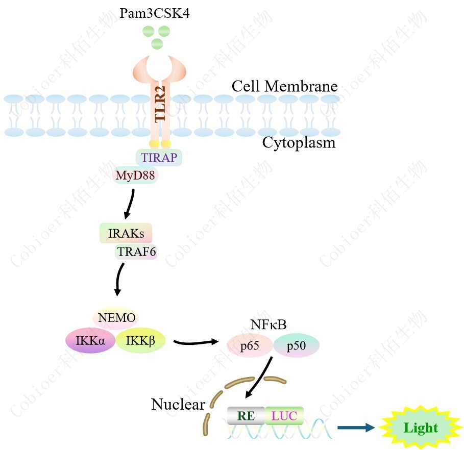 TLR2 NFκB-Luc HEK293 報告基因藥靶模型很好的模擬了體內 TLR2 的信號轉導過程, 原理見下圖所示。
