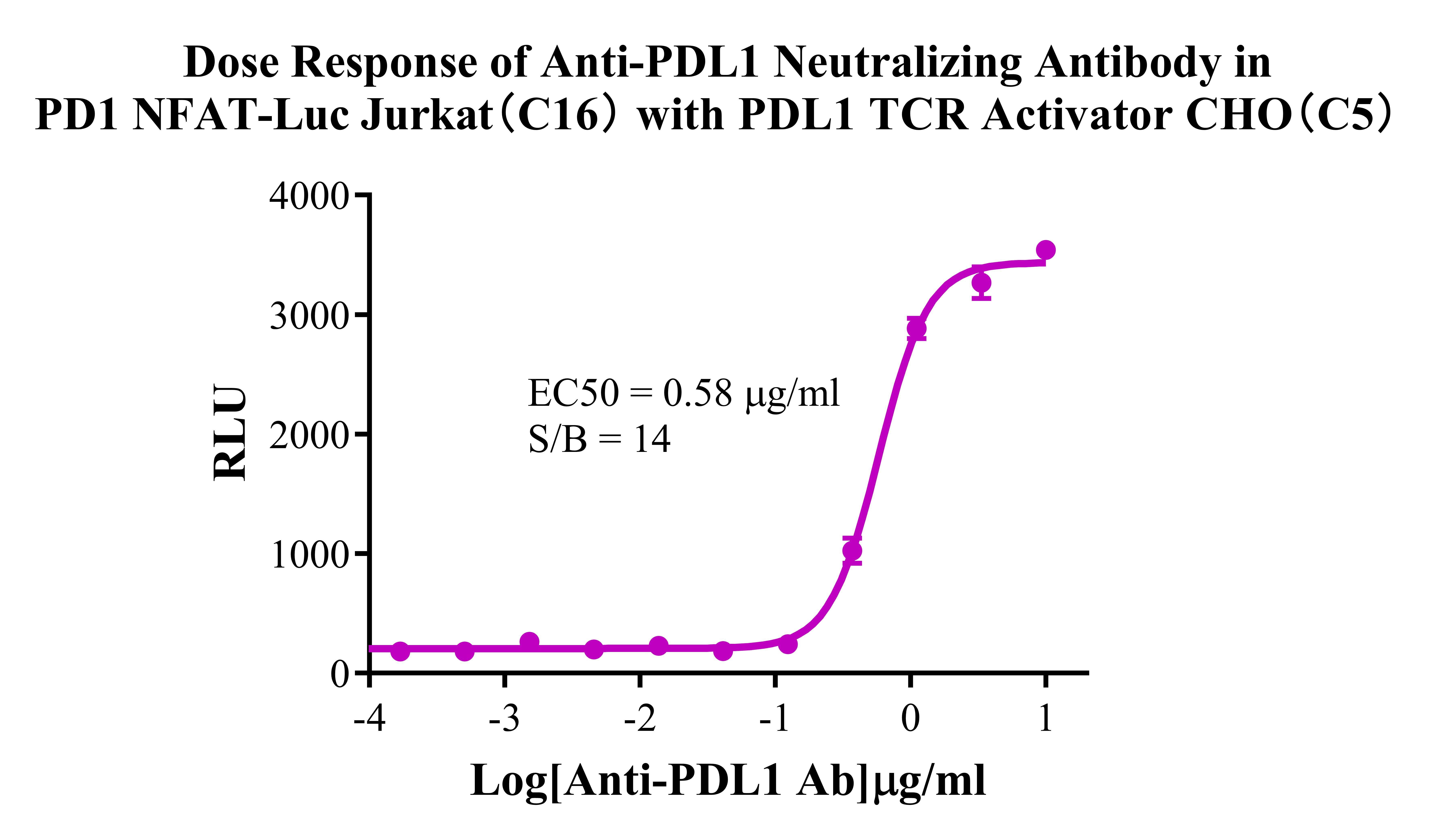 Figure 4. Detect Luciferase assay by Ultra Luciferase Detection Kit CBPH0001(we strongly suggest to purchase from Cobioer). Dose response of Anti-PDL1 Neutralizing Antibody in PD1 NFAT-Luc Jurkat(C16) with PDL1 TCR Activator CHO(C5)..