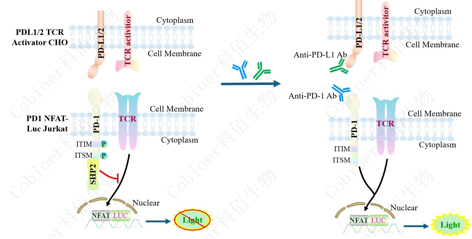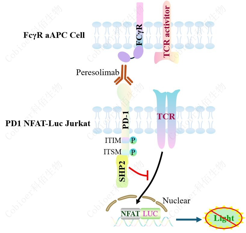 PD1 NFAT-Luc Jurkat 報告基因藥靶模型很好的模擬了體內 PD1&PDL1/PDL2 的信號轉 導過程,原理見下圖所示。![]() ![]() Figure 1. PD1 NFAT-Luc Jurkat 細胞模型原理圖 |