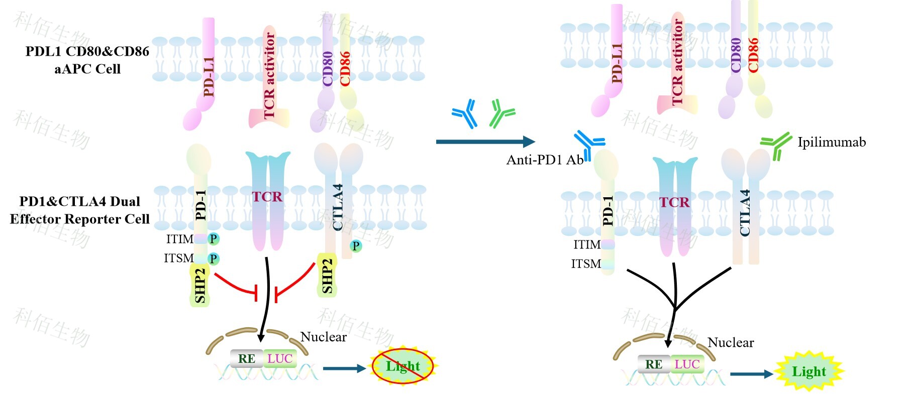 PDL1 CD80&CD86 aAPC Cell 作為 PD1&CTLA4 Dual Effector Reporter Cell 的靶細胞,很好的模擬了體內 PD1&CTLA4 的信號轉導過程,原理見下圖所示。