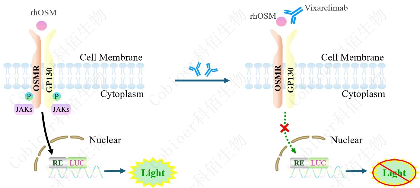OSMR Effector Reporter Cell 報告基因藥靶模型很好的模擬了體內 OSMR 的信號轉導過程,原理見圖所示。![]() Figure 1. OSMR Effector Reporter Cell 細胞模型原理圖 |