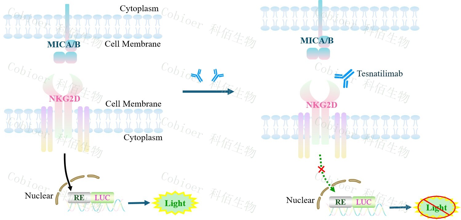 NKG2D Effector Reporter Cell 報告基因藥靶模型很好的模擬了體內 NKG2D 的信號轉導過程,原理見下圖所示。![]() Figure 1. NKG2D Effector Reporter Cell 細胞模型原理圖 |