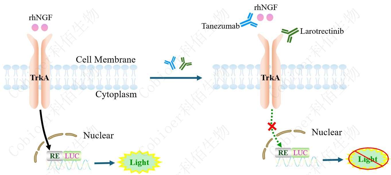 NGF/TRKA Effector Reporter Cell 報(bào)告基因藥靶模型很好的模擬了體內(nèi) NGF/TRKA 的 信號(hào)轉(zhuǎn)導(dǎo)過程,原理見下圖所示。
