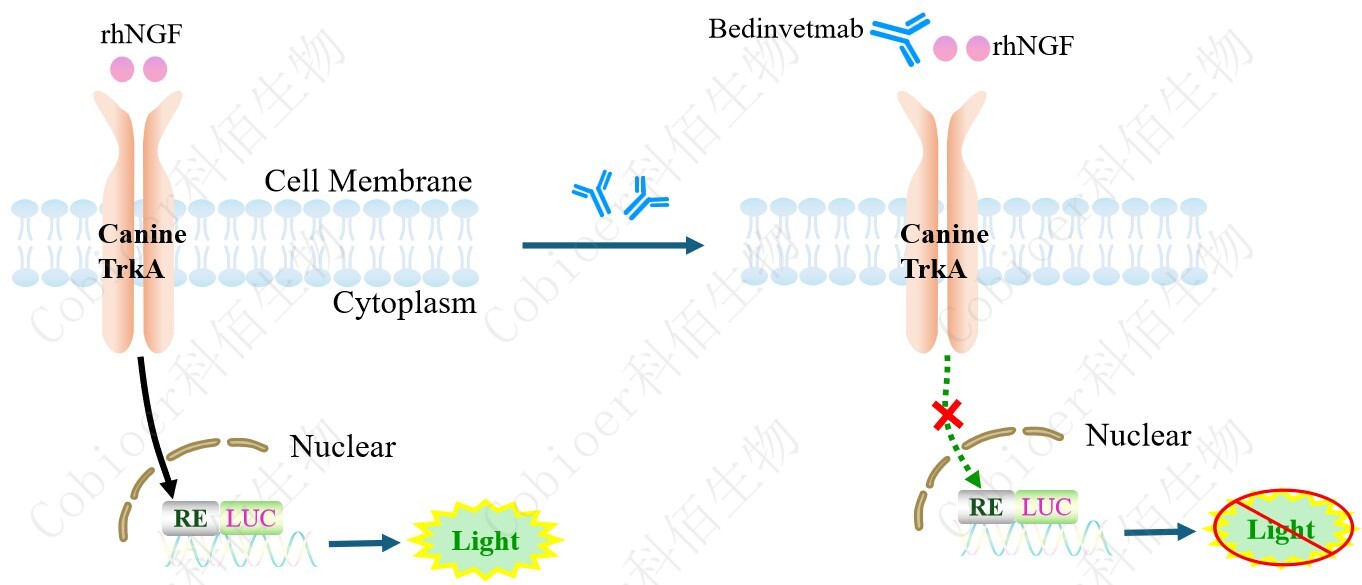 NGF/Canine TRKA Effector Reporter Cell 報告基因藥靶模型很好的模擬了體內 NGF/Canine TRKA 的信號轉導過程,原理見下圖所示。