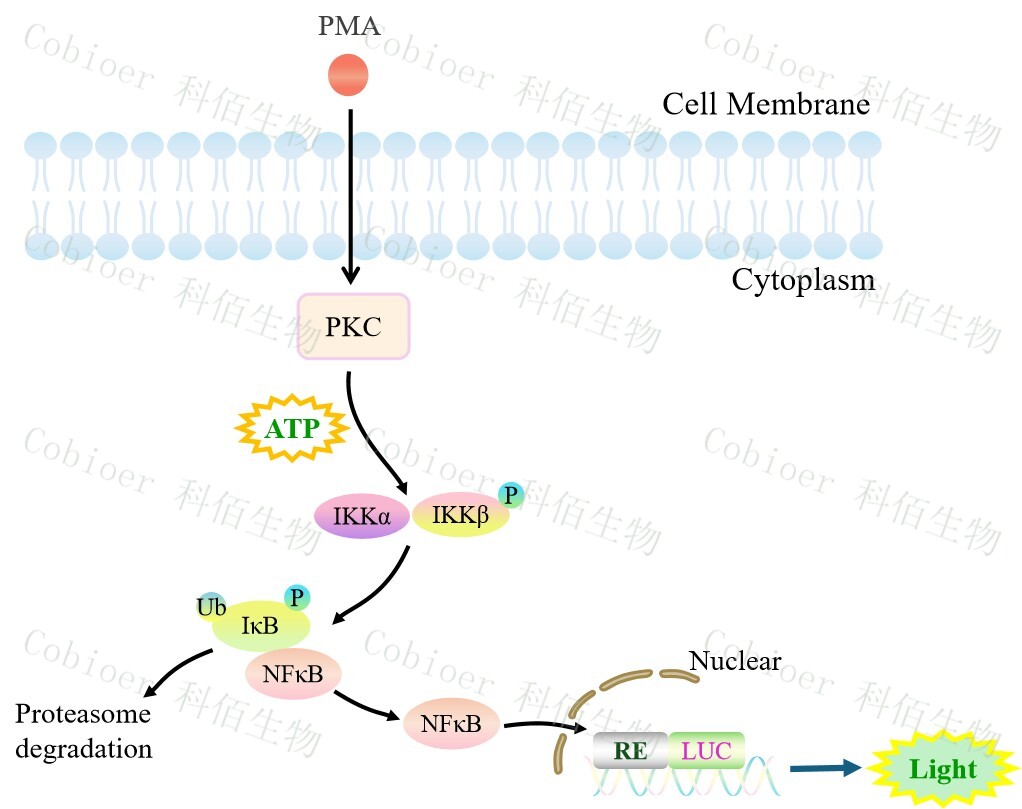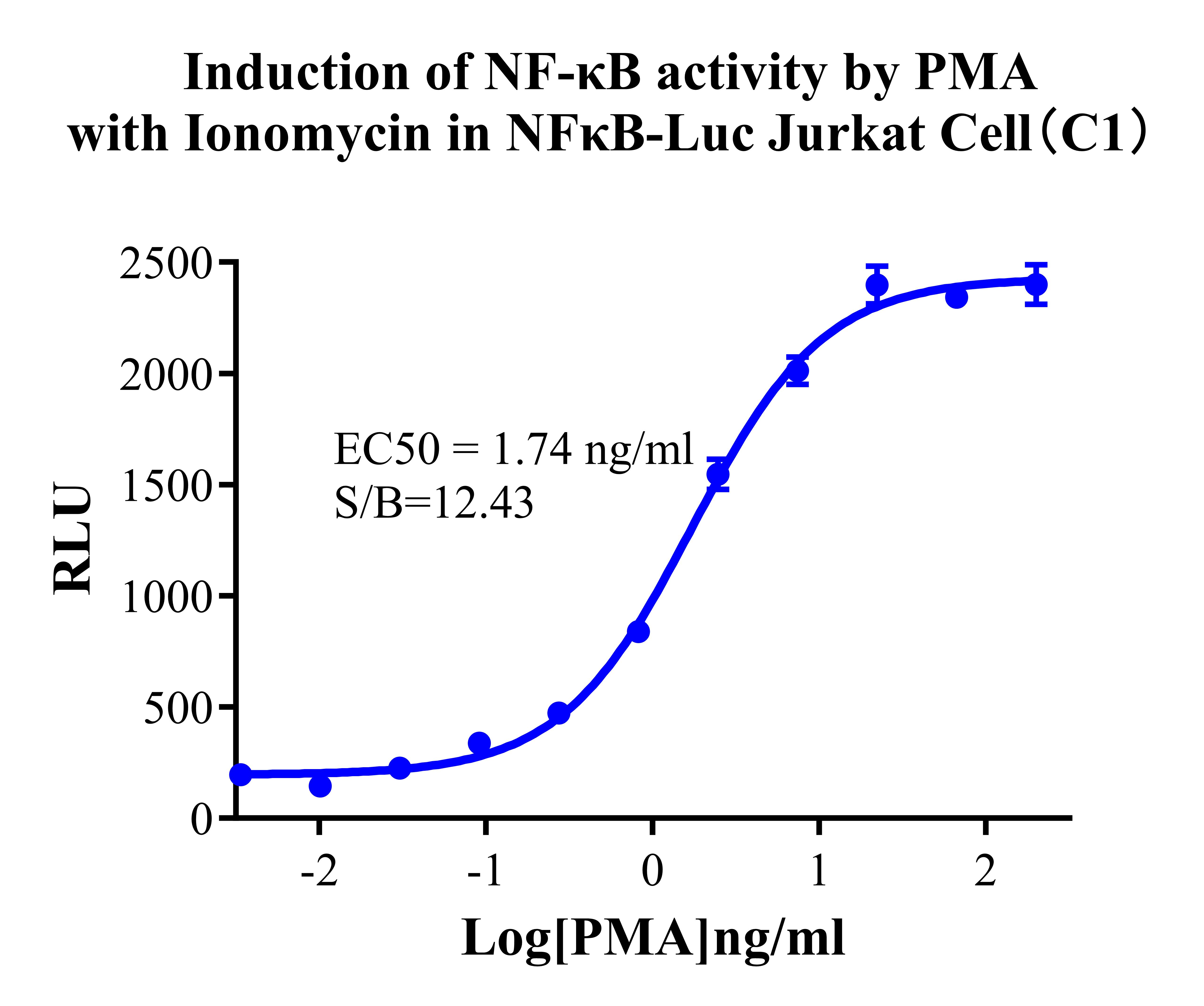 NFκB-Luc Jurkat 報告基因細胞是由 NFκB 調控并表達 Luc 熒光素酶報 告基因的 Jurkat細胞。PMA 是 DAG(二酯酰甘油)的類似物,可自由的通過細胞膜,直接 作用于細胞活化信號轉導通路上的 PKC,原理見下圖所示。![]() Figure 1:NFκB-Luc Jurkat 細胞模型原理圖