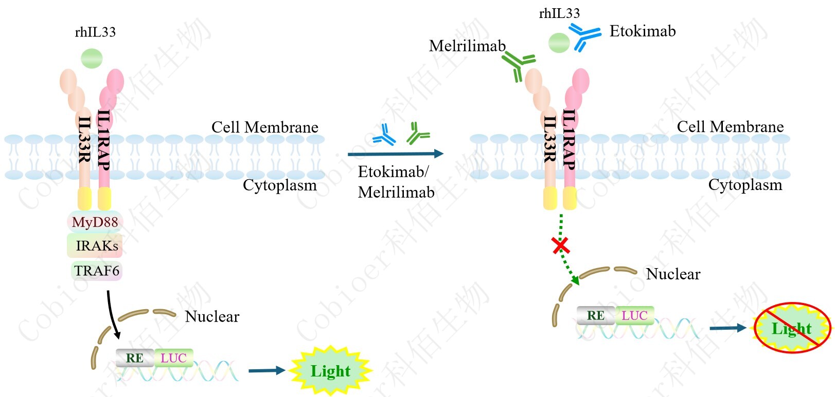 IL33 Effector Reporter Cell 報告基因藥靶模型很好的模擬了體內 IL33 的信號轉導過程, 原理見下圖所示。 Figure 1. IL33 Effector Reporter Cell 細胞模型原理圖 |