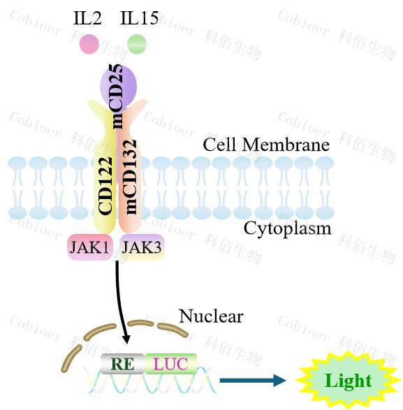 Figure 1. hIL2/IL15(mCD25 hCD122 mCD132)Effector Reporter Cell 細胞模型原理圖 |