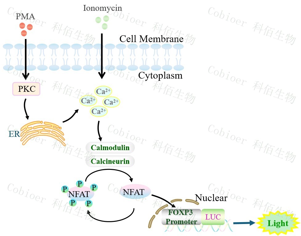 FOXP3 promoter-Luc Jurkat 報(bào)告基因細(xì)胞,是由 FOXP3 調(diào)控并表達(dá) Luc 熒光素酶報(bào)告基因的 Jurkat 細(xì)胞。PMA 是 DAG(二酯酰甘油)的類似物,可自由的通過 細(xì)胞膜,可用于測定 CD3/CD28 介導(dǎo)的 T 細(xì)胞活化,原理見下圖所示。
