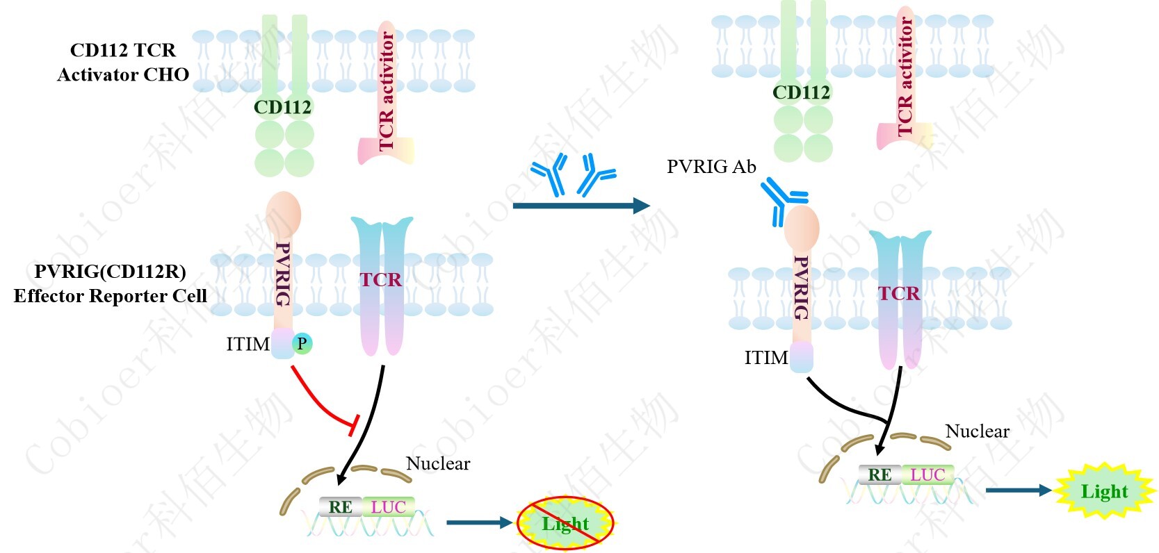 PVRIG(CD112R) Effector Reporter Cell 報(bào)告基因藥靶模型很好的模擬了體內(nèi) PVRIG 的 信號轉(zhuǎn)導(dǎo)過程,原理見下圖所示。