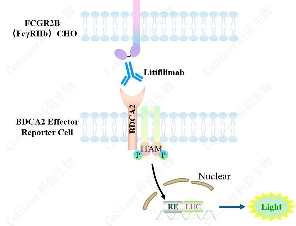BDCA2 Effector Reporter 報告基因藥靶模型很好的模擬了體內 BDCA2 的信號轉導過程, 原理見下圖 所示。![]() Figure 1. BDCA2 Effector Reporter 細胞模型原理圖