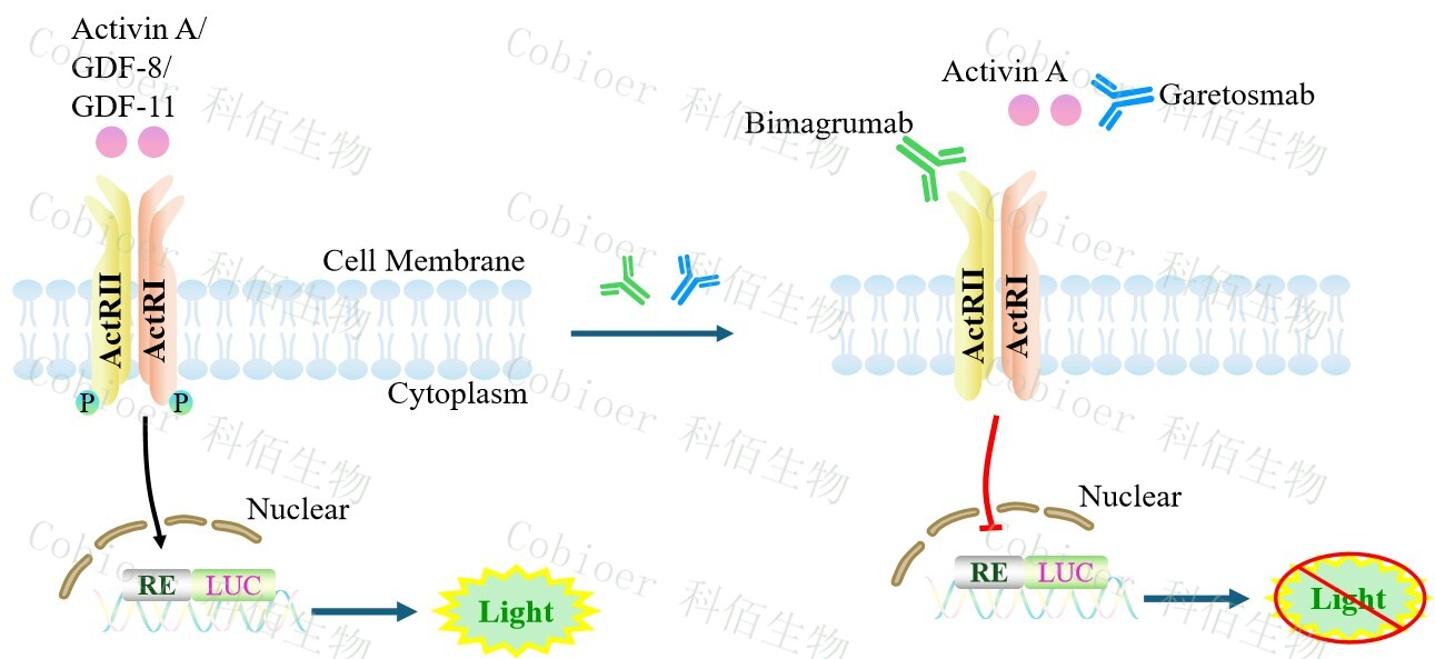 Activin A Effector Reporter Cell 報(bào)告基因藥靶模型很好的模擬了體內(nèi) Activin A 的信號(hào)轉(zhuǎn)導(dǎo)過(guò)程,原理見下圖所示。![]() Figure 1. Activin A Effector Reporter Cell 細(xì)胞模型原理圖 |