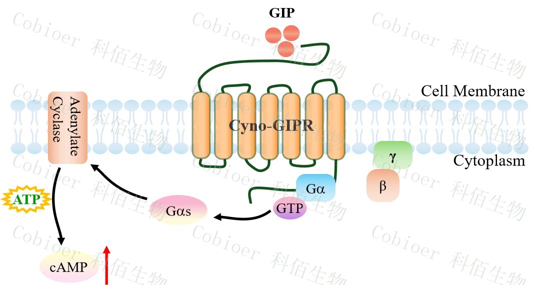 cAMP 在 G 蛋白偶聯受體(GPCR)信號轉導中是一種關鍵的第二信使。當配體結合到 GPCR,構象發生變化,激活受體接著激活G蛋白,Gs的激活導致腺苷酸環化酶調控cAMP 的升高。GIPR 藥靶模型很好的模擬了體內 GIPR 的信號轉導過程,原理見下圖所示。