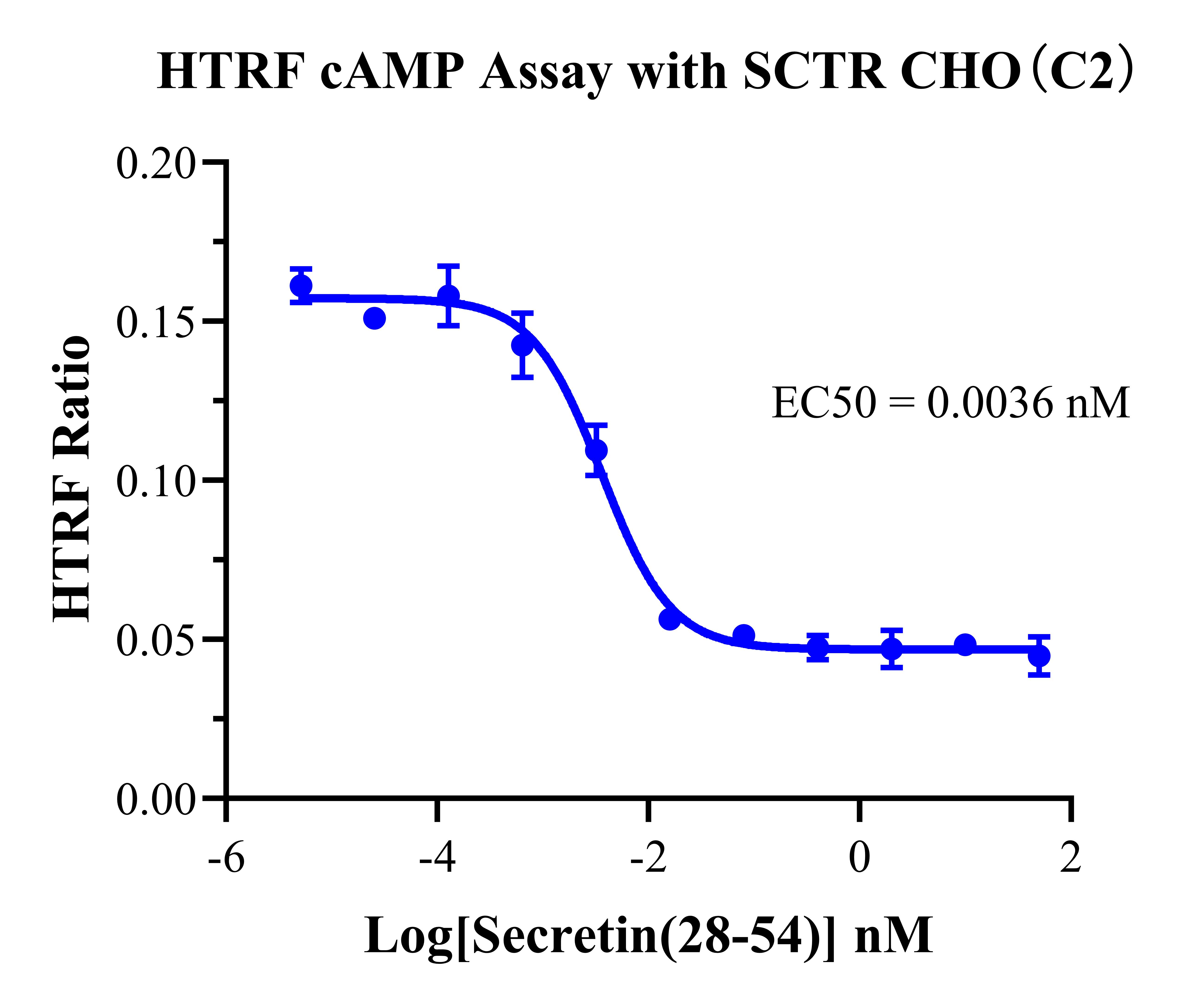 cAMP 在 G 蛋白偶聯受體(GPCR)信號轉導中是一種關鍵的第二信使。當配體結合到 GPCR, 構象發生變化,激活受體接著激活 G 蛋白,Gs 的激活導致腺苷酸環化酶調控 cAMP 的升高。 SCTR 藥靶模型很好的模擬了體內 SCTR 的信號轉導過程,原理見下圖所示。 |