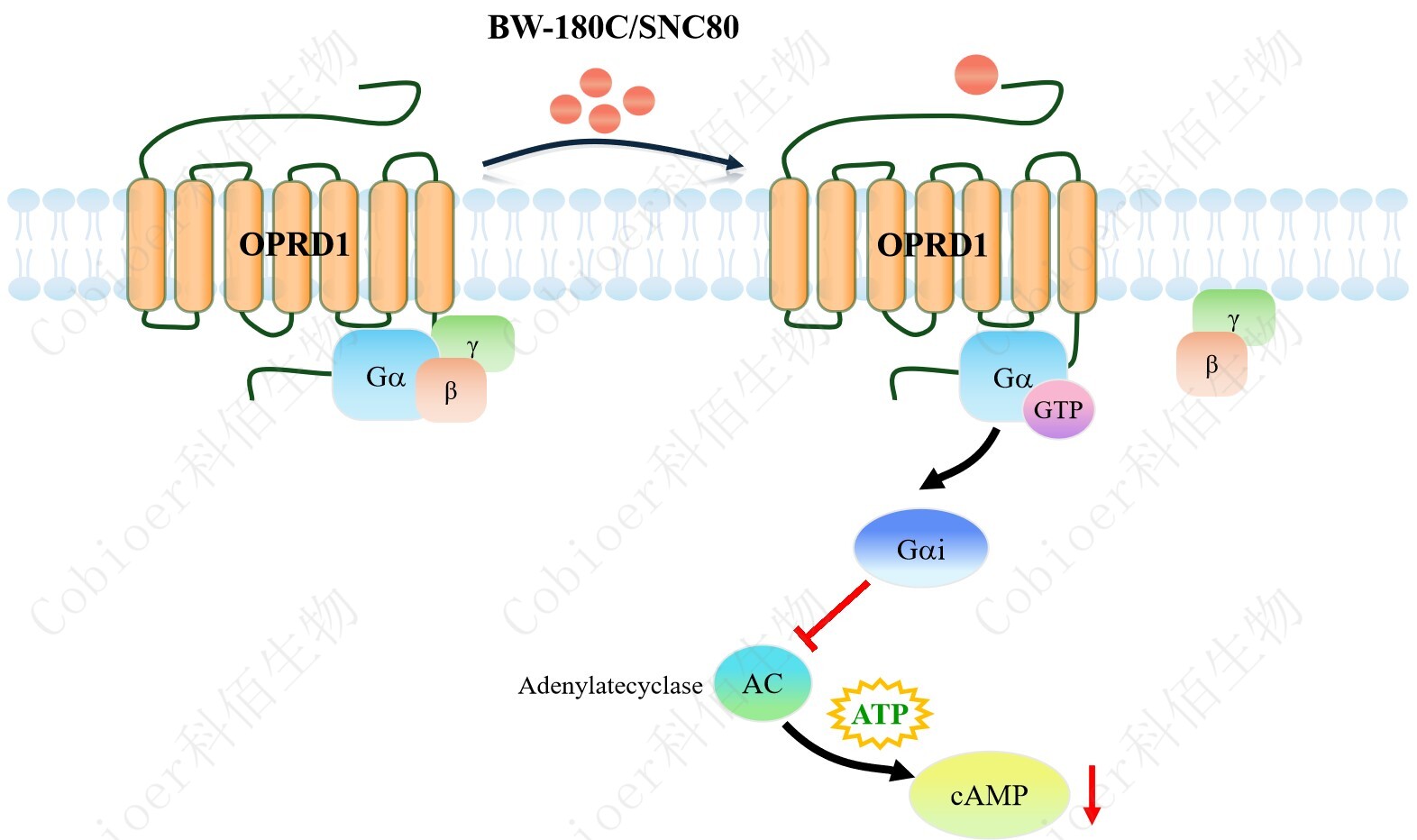 阿片受體家族包括κ-阿片受體(KOP)、 δ-阿片受體(DOP)、µ-阿片受體(MOP) 和痛覺肽阿片受體(NOP),均屬于 G 蛋白偶聯受體,主要通過偶聯下游 Gi 蛋白發揮功 能。OPRD1 是一種 G 蛋白偶聯受體,作為內源性腦啡肽和其他阿片亞群的受體。配體結合 引起構象改變,通過鳥嘌呤核苷酸結合蛋白(G 蛋白)觸發信號,并調節下游效應物(如腺苷 酸環化酶)的活性。信號傳導導致腺苷酸環化酶活性的抑制。它通過減少鈣離子電流和增加 鉀離子電導來抑制神經遞質釋放。它在疼痛的感知和阿片介導的鎮痛中起作用。 |