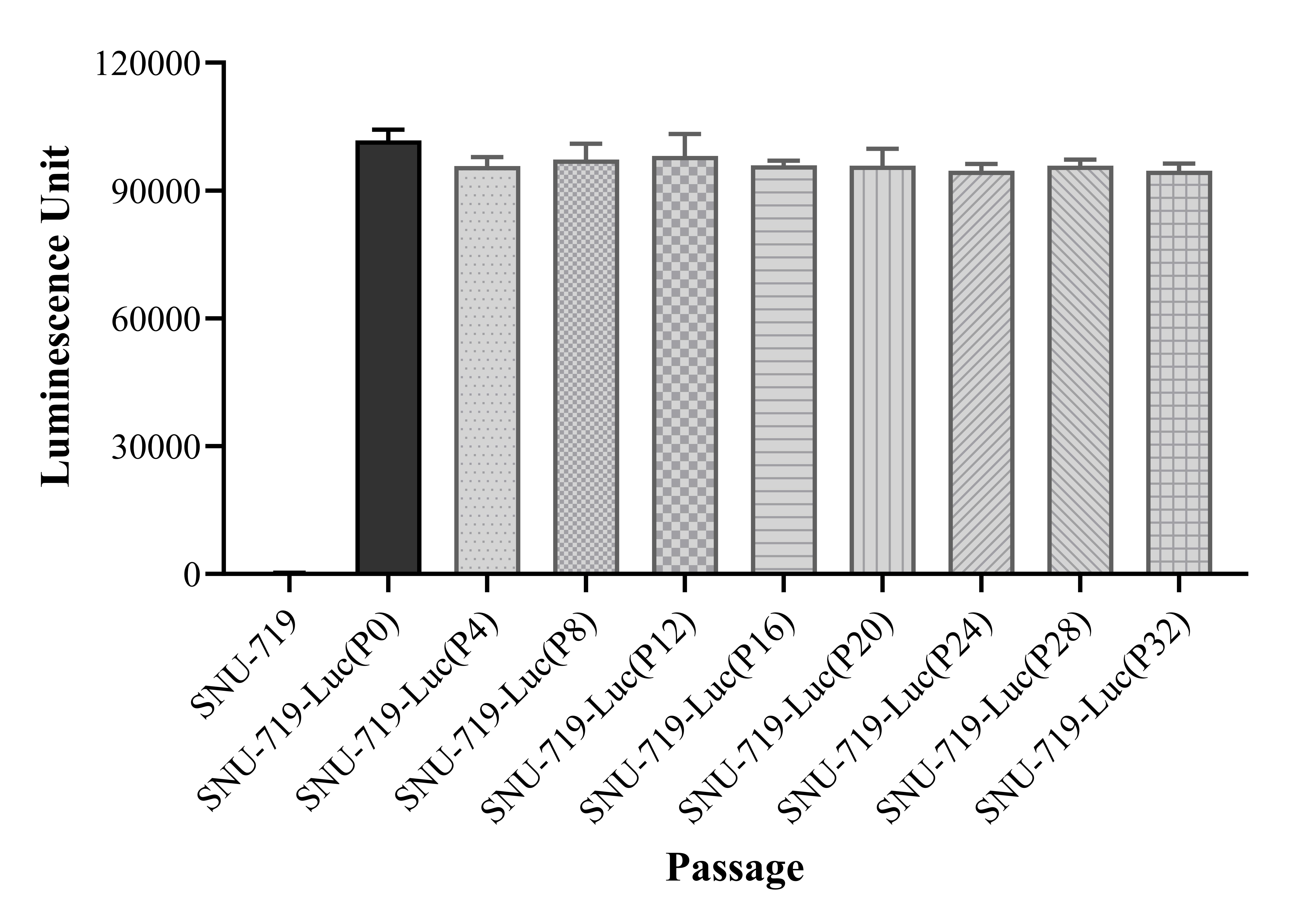 Figure 1. Stablity test results. SNU-719-Luc showed at least 32 passage stability with similar luminescence unit. |