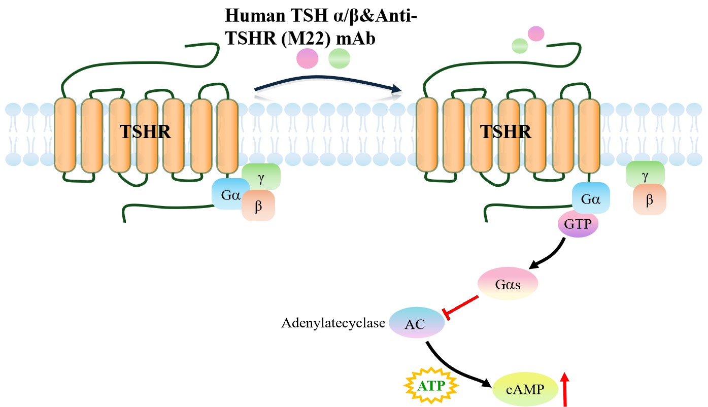 cAMP 在 G 蛋白偶聯受體(GPCR)信號轉導中是一種關鍵的第二信使。當配體結合 到 GPCR,構象發生變化,激活受體接著激活 G 蛋白,Gs 的激活導致腺苷酸環化酶調控 cAMP 的升高。TSHR 藥靶模型很好的模擬了體內 TSHR 的信號轉導過程,原理見下圖所示。 |