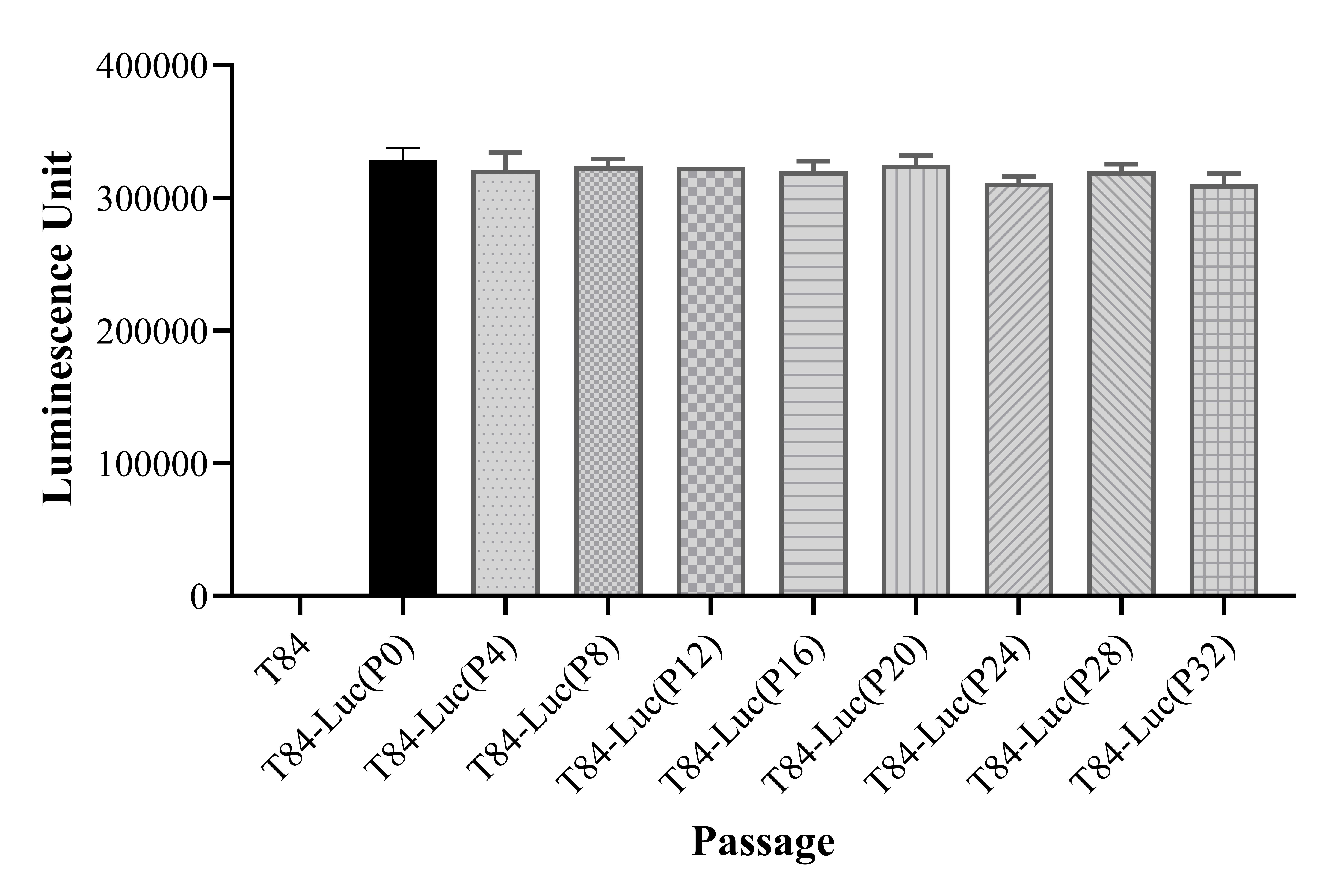 Figure 1. Stablity test results. T84-Luc showed at least 32 passage stability with similar luminescence unit. |