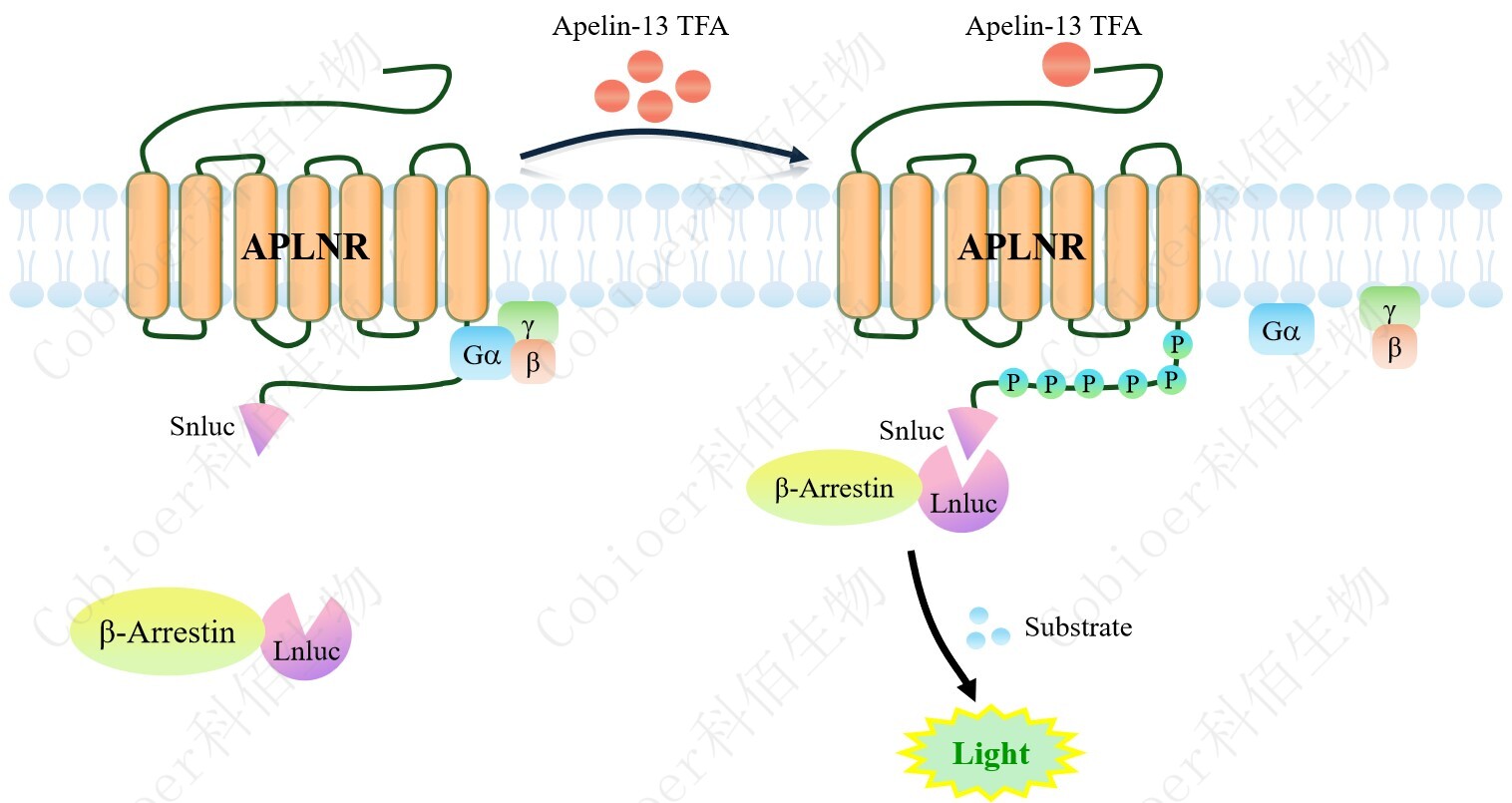 APLNR(APJ) β-Arrestin CHO 報告基因藥靶模型很好的模擬了體內 APLNR(APJ) /β-Arrestin 的信號轉導過程,原理見下圖所示。當缺乏配體刺激時,β-Arrestin 不與 APLNR (APJ)結合,融合β-Arrestin 的熒光素酶處于失活構象,當 APLNR(APJ)遭遇配體刺激 時,融合熒光素酶報告基因的β-Arrestin 被招募,使熒光素酶報告基因處于激活狀態,加入 其底物后發光信號增強。![]() Figure 1. APLNR(APJ) β-Arrestin CHO 細胞模型原理圖 |
