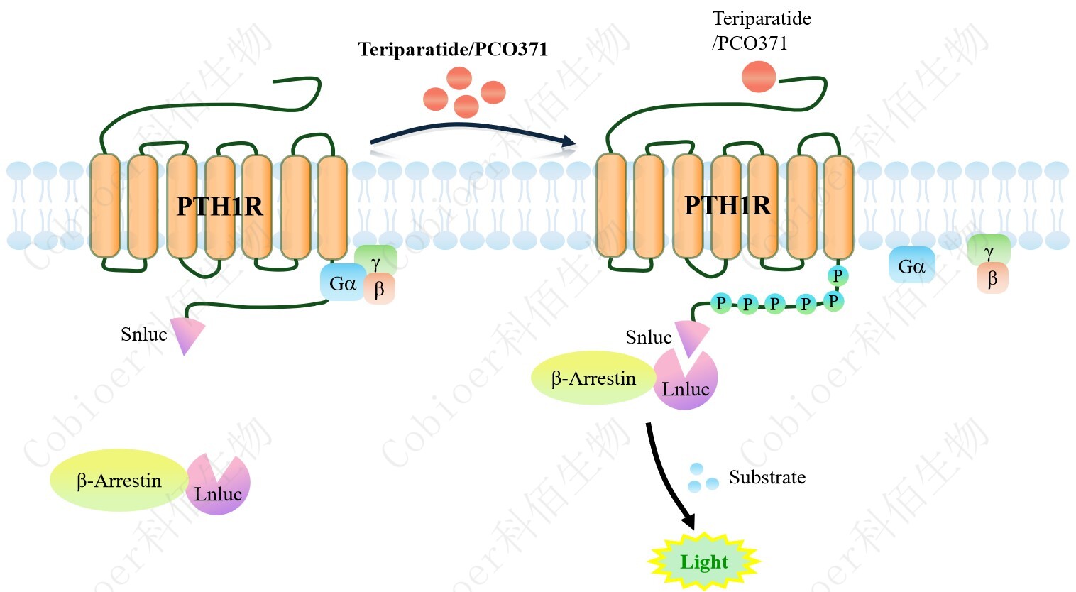 PTH1R β-Arrestin CHO PTH1R β-Arrestin CHO 報告基因藥靶模型很好的模擬了體內 PTH1R/β-Arrestin 的信號 轉導過程,原理見下圖所示。當缺乏配體刺激時,β-Arrestin 不與 PTH1R 結合,融合β- Arrestin 的熒光素酶處于失活構象,當 PTH1R 遭遇配體刺激時,融合熒光素酶報告基因的 β-Arrestin 被招募,使熒光素酶報告基因處于激活狀態,加入其底物后發光信號增強。 ![]() Figure 1. PTH1R β-Arrestin CHO 細胞模型原理圖 |