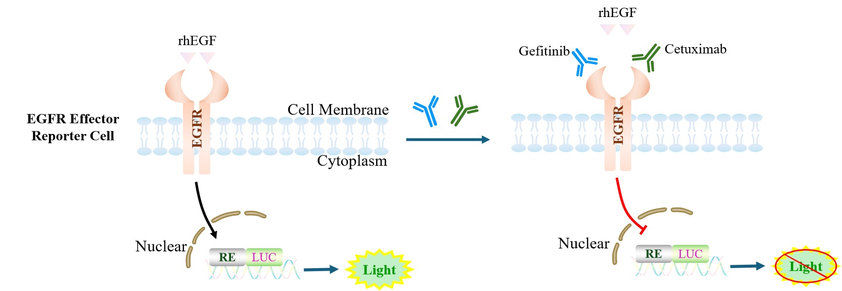 EGFR Effector Reporter Cell 報告基因藥靶模型很好的模擬了體內 EGFR 的信號轉導過程, 原理見下圖所示。