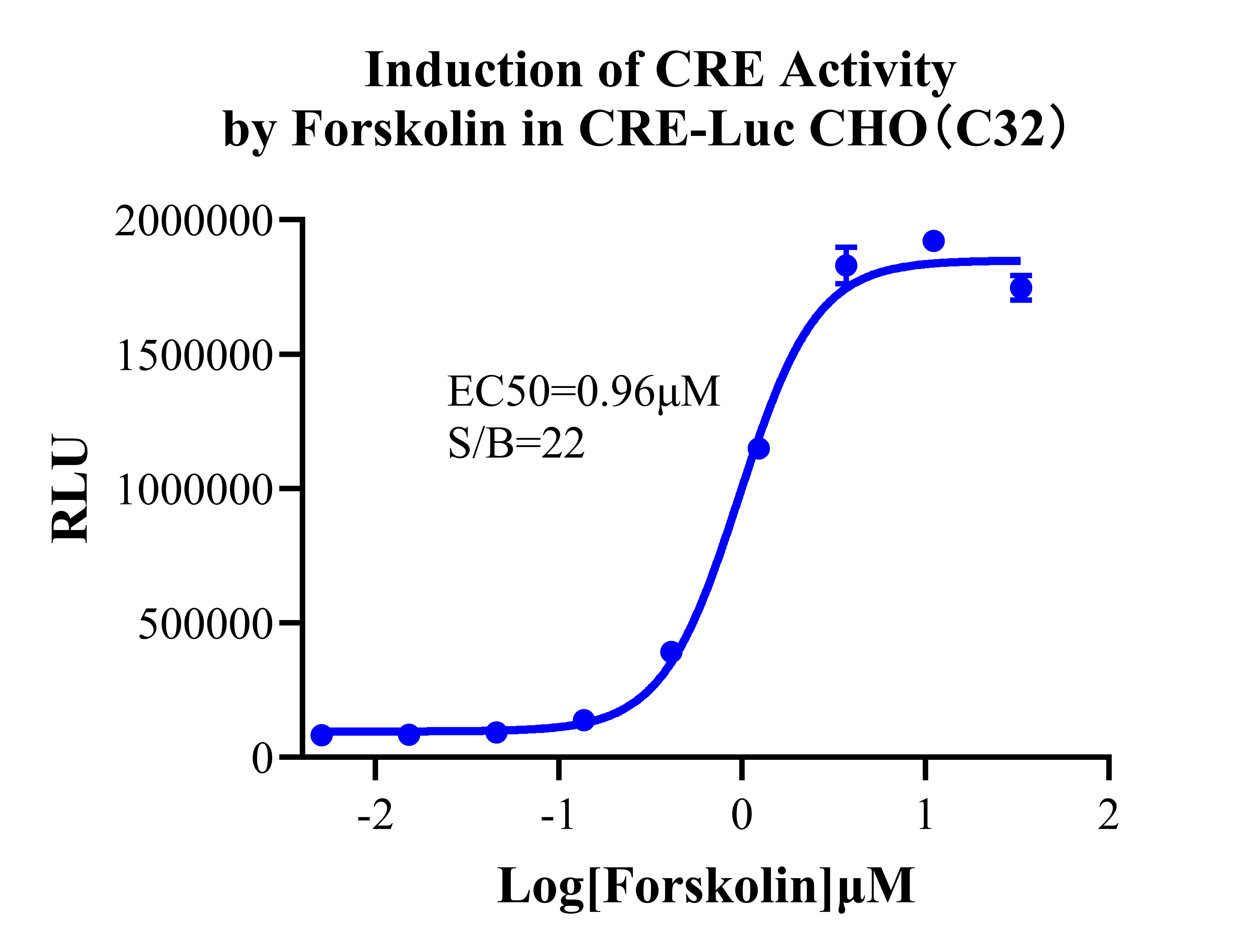 CRE-Luc CHO 報告基因細胞,是由 CRE 調控并表達 Luc 熒光素酶報告 基因的 CHO 細胞。Forskolin 是天然存在的直接腺苷酸環化酶(AC)/cAMP/CREB 的激活 劑,原理見下圖所示。