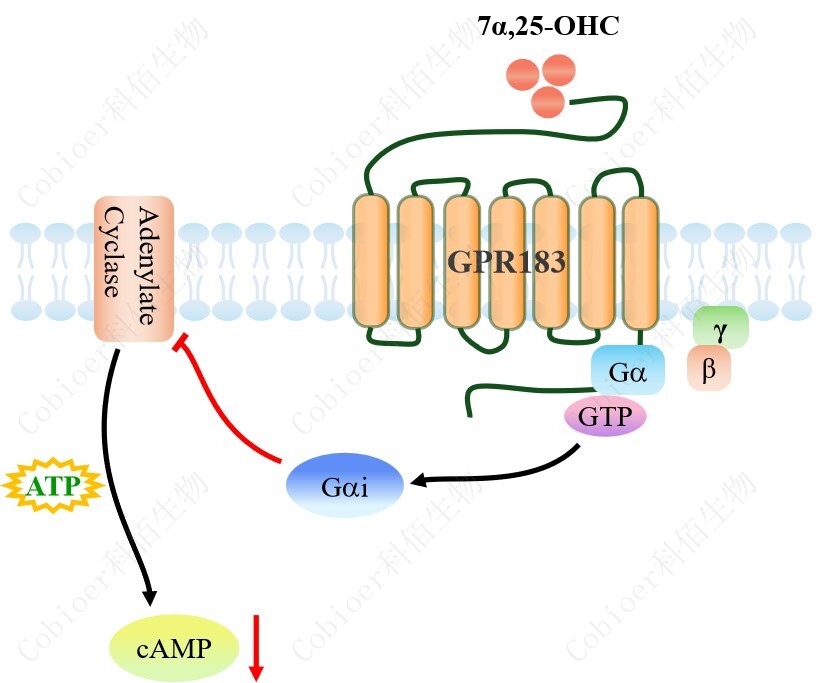 cAMP 在 G 蛋白偶聯受體(GPCR)信號轉導中是一種關鍵的第二信使。當配體結合 到 GPCR,構象發生變化,激活受體接著激活 G 蛋白,Gi 的激活導致腺苷酸環化酶調控 cAMP 的下調。GPR183(EBI2) CHO 藥靶模型很好的模擬了體內 GPR183(EBI2)的信號轉導過程,原理見下圖所示。