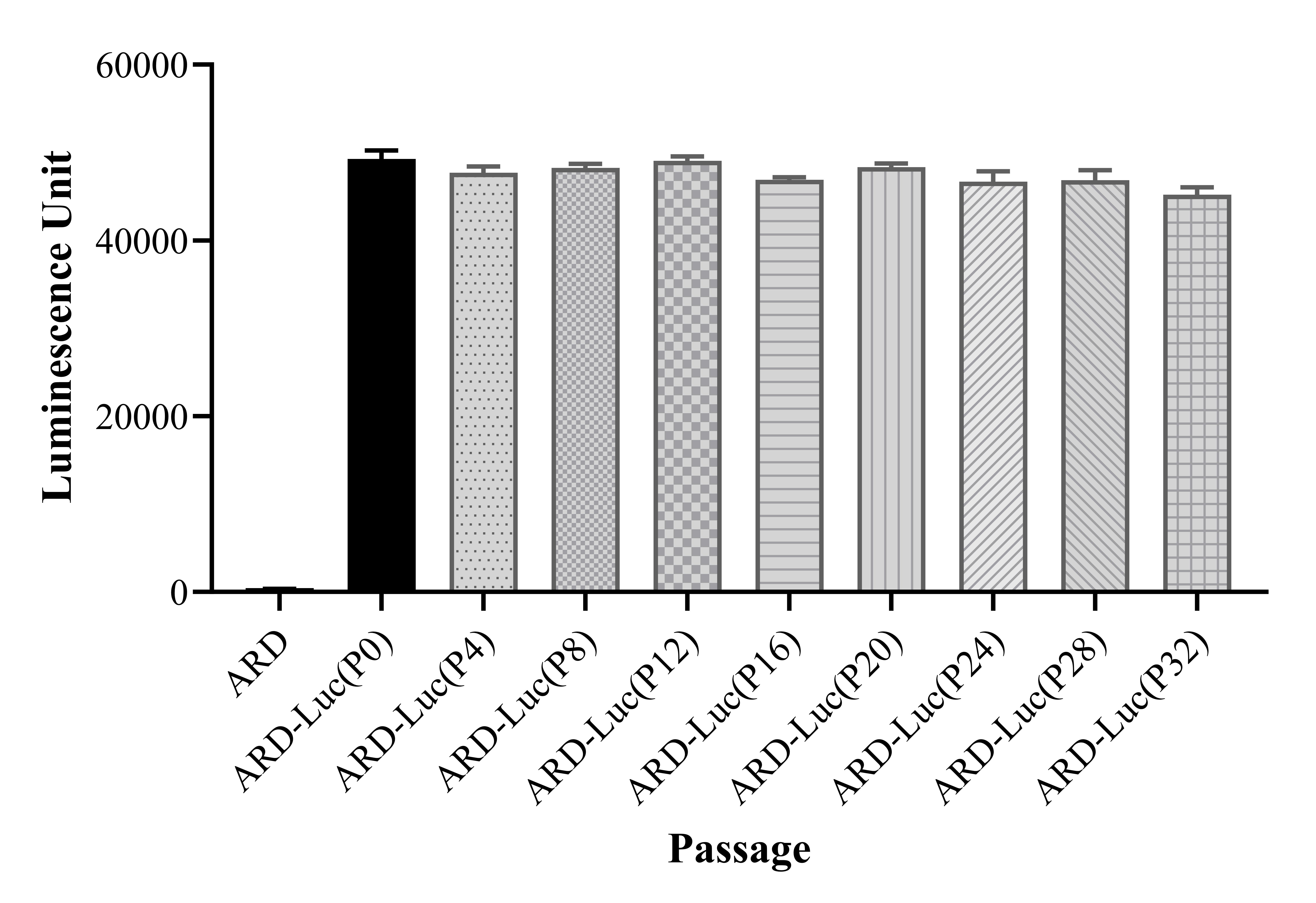Figure 1. Stablity test results. ARD-Luc showed at least 32 passage stability with similar luminescence unit. |