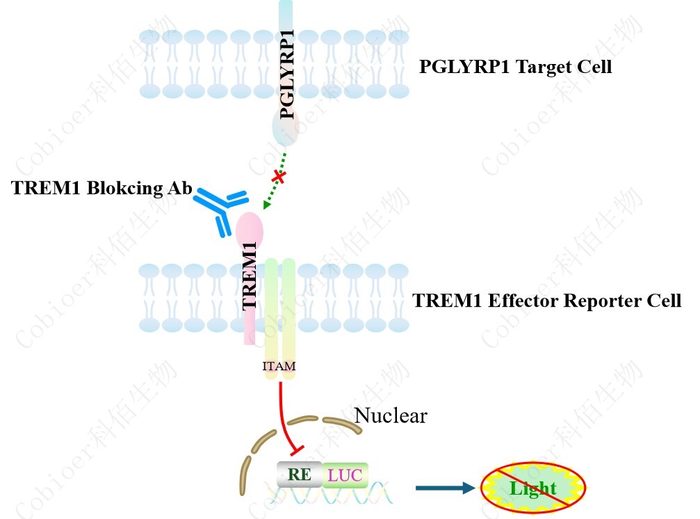 PGLYRP1 Target Cell 作為 TREM1 Effector Reporter Cell 的靶細胞,很好的模擬了體內 TREM1 的信號轉導過程,原理見下圖所示。