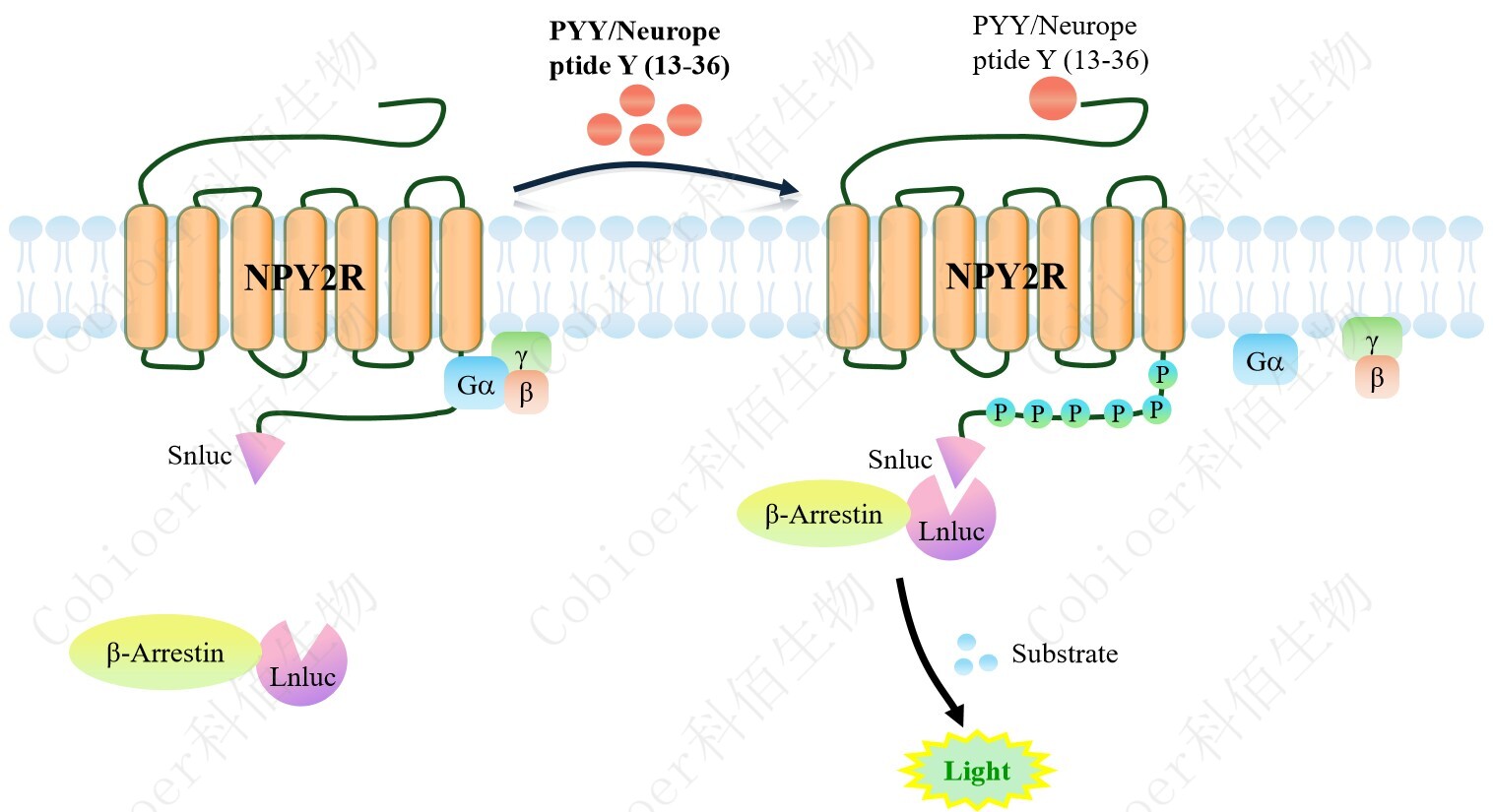 NPY2R β-Arrestin CHO 報告基因藥靶模型很好的模擬了體內 NPY2R/β-Arrestin 的信號 轉導過程,原理見下圖所示。當缺乏配體刺激時,β-Arrestin 不與 NPY2R 結合,融合β- Arrestin 的熒光素酶處于失活構象,當 NPY2R 遭遇配體刺激時,融合熒光素酶報告基因的β-Arrestin 被招募,使熒光素酶報告基因處于激活狀態,加入其底物后發光信號增強。
