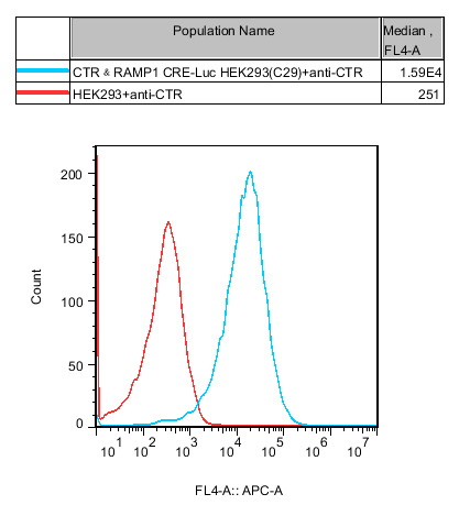V. Representative Data![]() Figure 2. WB of CTR&RAMP1 CRE-Luc HEK293. ![]() Figure 3. Recombinant CTR&RAMP1 CRE-Luc HEK293 stably expressing CTR&RAMP1. ![]() Figure 4. Detect Luciferase assay by Ultra Luciferase Detection Kit CBPH0001(we strongly suggest to purchase from Cobioer). Dose Response of CTR/RAMP1 Agonists in CTR&RAMP1 CRE-Luc HEK293 (C29).