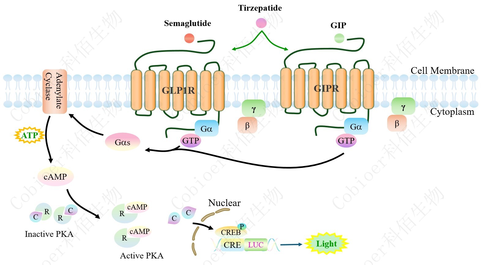 GLP1R&GIPR Dual Reporter Cell 報告基因藥靶模型很好的模擬了體內 GLP1R&GIPR的信號轉導過程,原理見下圖所示。