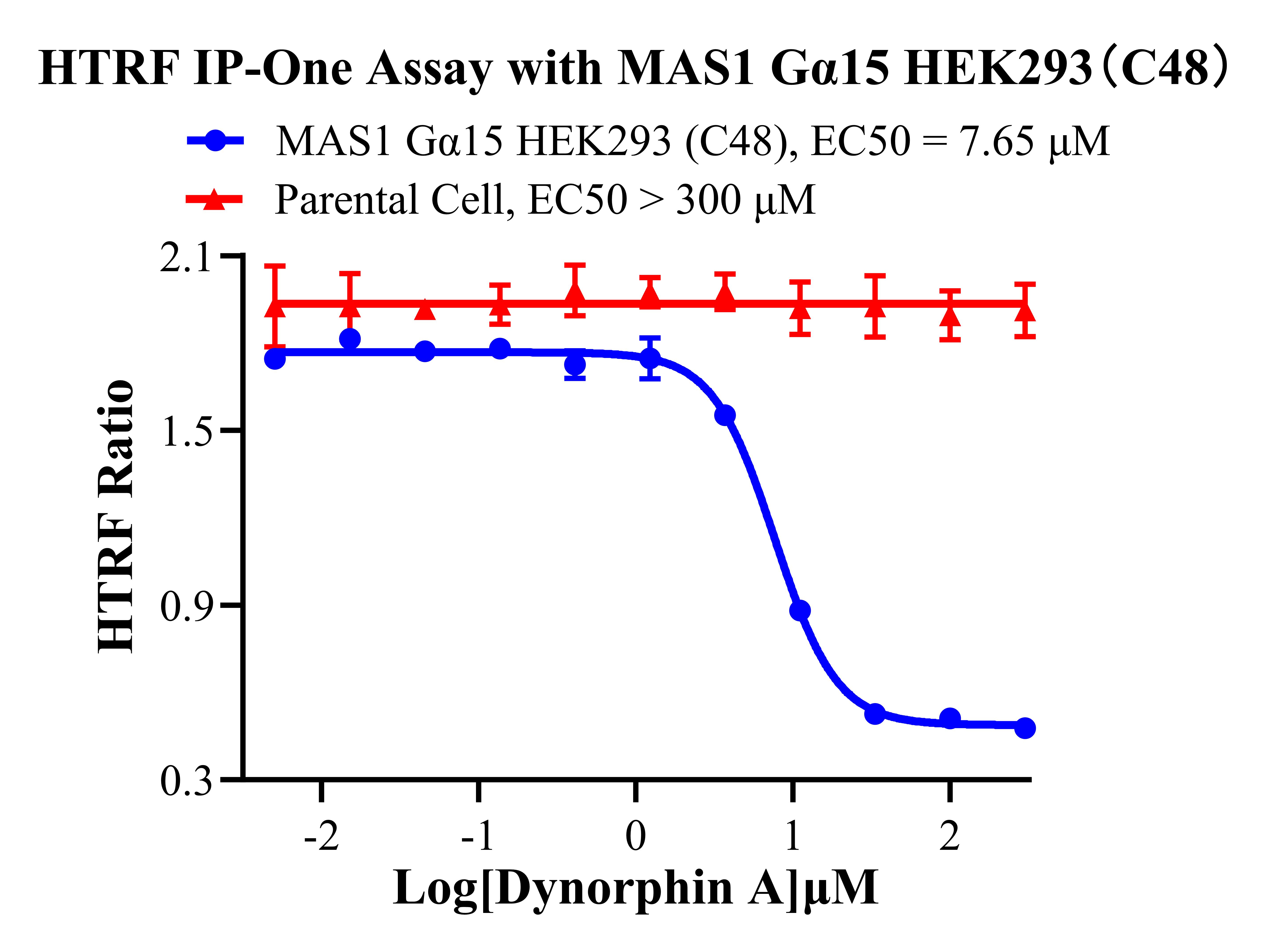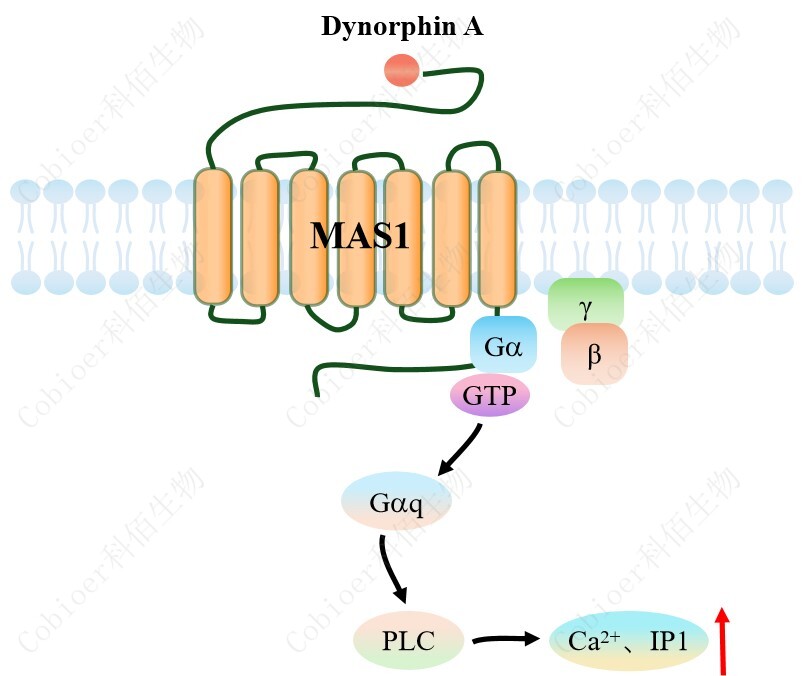 MAS1 可以通過 Gq 蛋白的信號通路,調控 IP1 的升高。MAS1 與配體結合,導致 Gαq 亞基的激活,觸發 PLC-γ,從而產生兩個第二信使:IP3 和 DAG,它們參與細胞內鈣動員。 由于 IP3 在代謝上不穩定,因此測量通路激活的替代標志物 IP1 作為檢測標準。