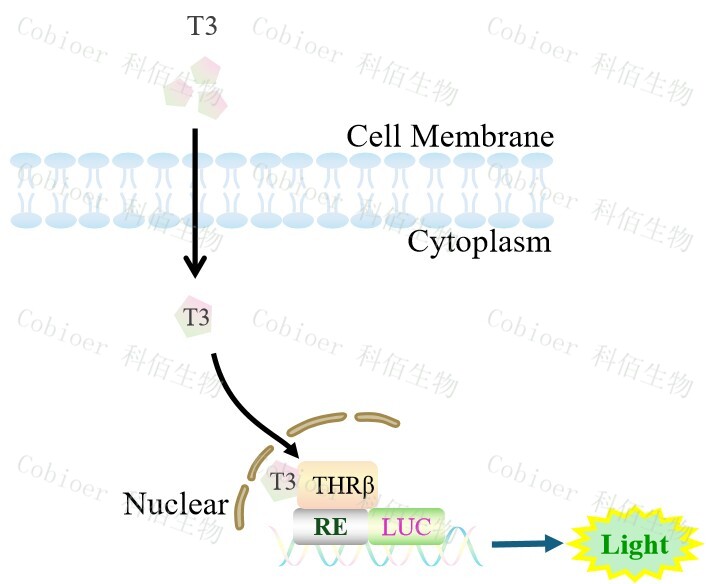 THRB Luciferase Reporter HEK293,是由 THRB 調控并表達 Luc 熒光素 酶報告基因的 HEK293 細胞。甲狀腺激素(T3/T4)是一種有效的甲狀腺激素,主要通過結 合 TRs 發揮作用,調控基因表達和細胞功能,原理見下圖所示。![]() Figure 1. THRB Luciferase Reporter HEK293 原理示意圖