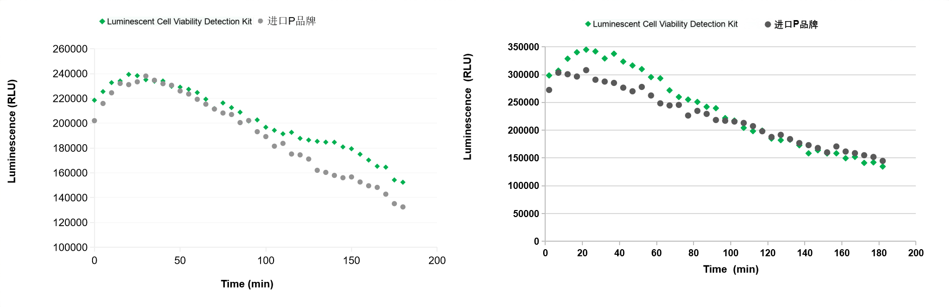 2. 半衰期 ![]() Figure 3. 生物發光穩定性的檢測。分別使用Luminescent Cell Viability Detection Kit和進口P公司同類對照對2萬個/孔CTLL-2細胞(左圖)和5萬個/孔UC-MSC細胞(右圖)進行持續3小時的生物發光強度檢測。