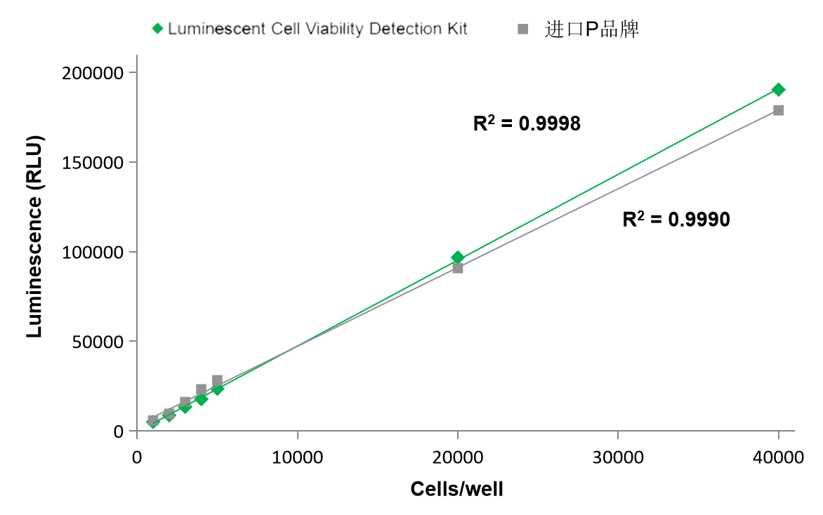 3. 線性 ![]() Figure 4. 比較不同細胞數的線性范圍。分別使用Luminescent Cell Viability Detection Kit和進口P公司同類對照檢測不同數量CHO-K1細胞(CD-CHO培養基)在黑色96孔板中生物發光強度,制成標準曲線。