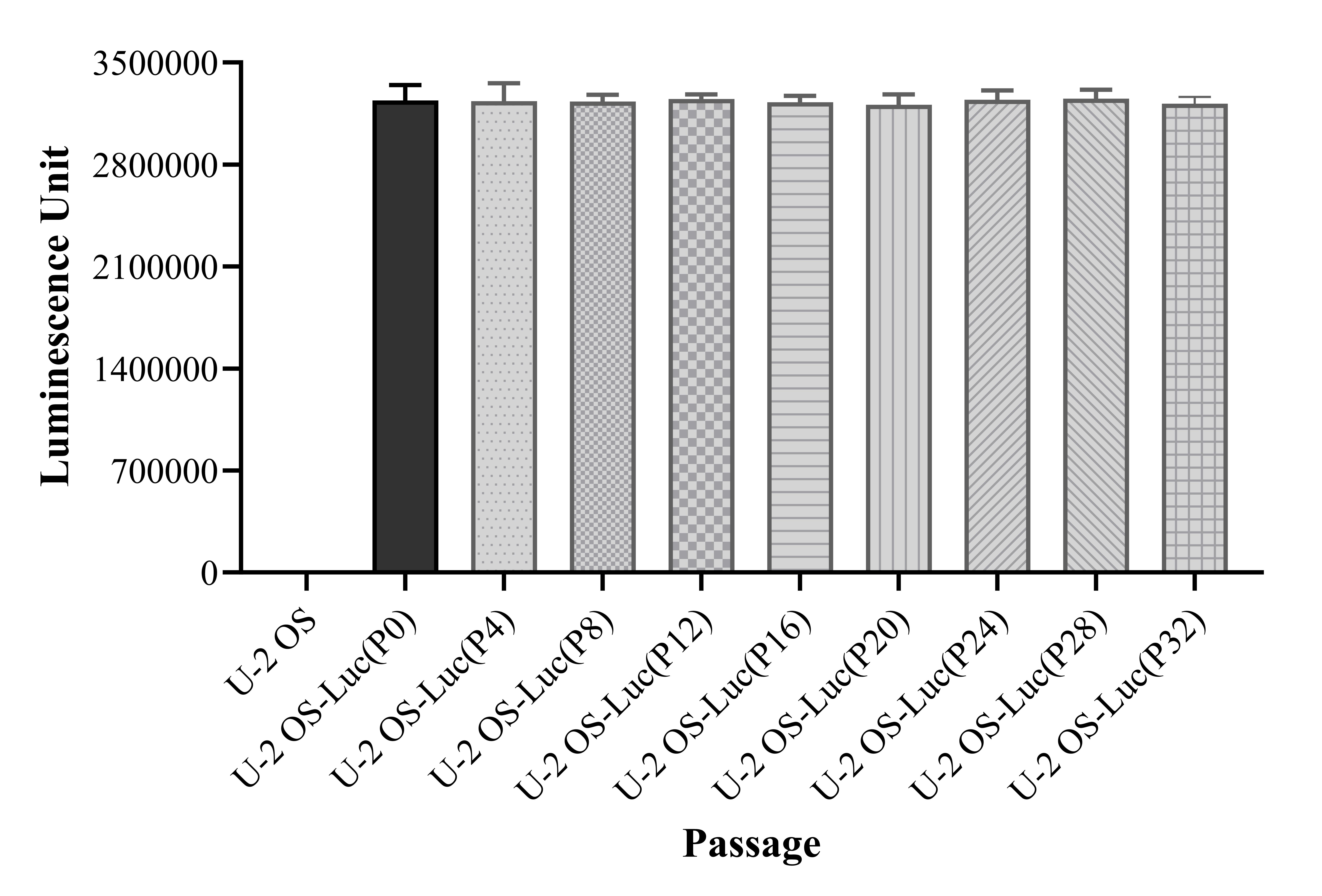 Figure 1. Stablity test results. U-2OS-Luc showed at least 32 passage stability with similar luminescence unit. |