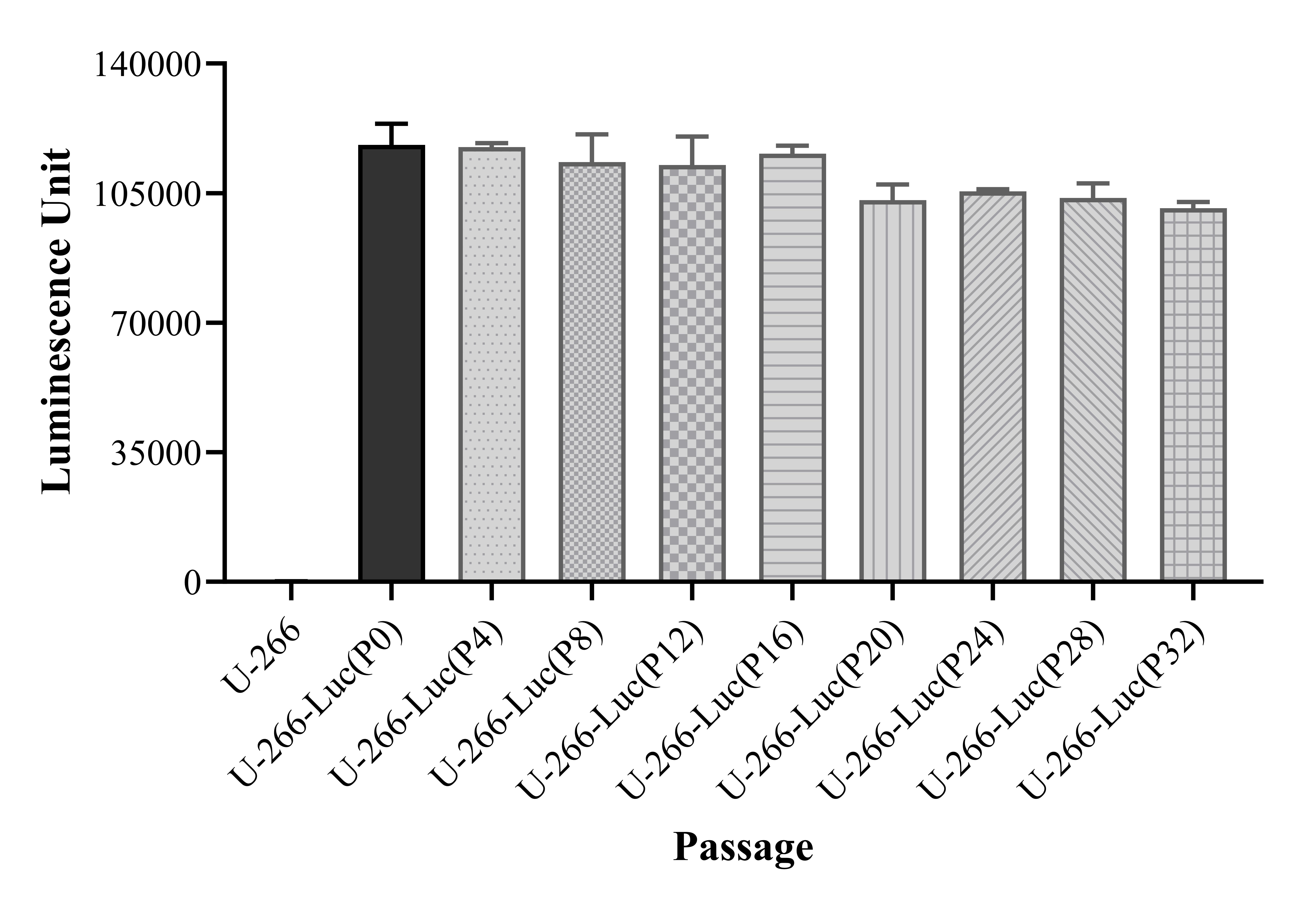 Figure 1. Stablity test results. U-266-Luc showed at least 32 passage stability with similar luminescence unit. |