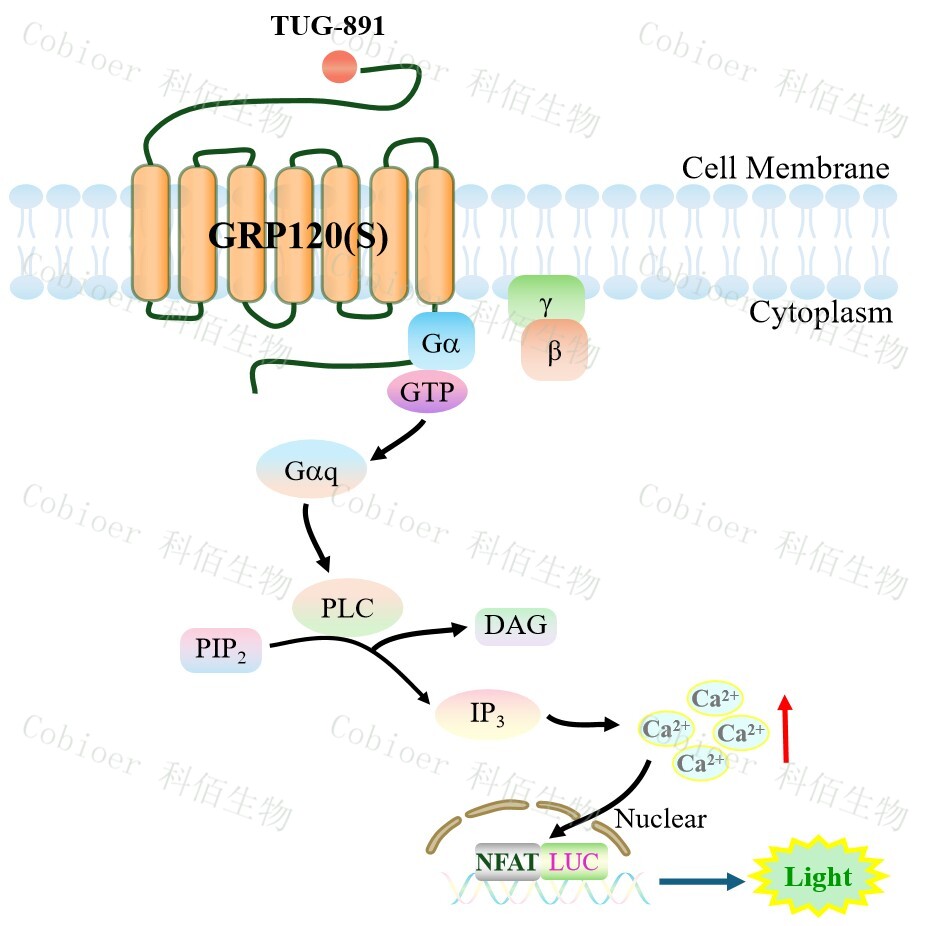 GPR120 與配體結(jié)合,導(dǎo)致 Gαq 亞基的激活,觸發(fā) PLC-γ,從而產(chǎn)生兩個(gè)第二信使: IP3 和 DAG,它們參與細(xì)胞內(nèi)鈣動(dòng)員。鈣離子濃度升高激活了 NFAT 轉(zhuǎn)錄因子家族。 GPR120(S) NFAT-Luc HEK293 細(xì)胞藥靶模型很好的模擬了體內(nèi) GPR120 的信號(hào)轉(zhuǎn)導(dǎo)過(guò)程, 原理見下圖所示。