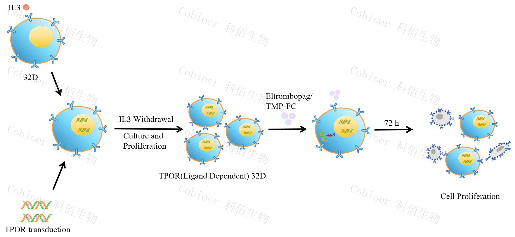 32D(小鼠原 B 細胞)的生長和增殖需要 IL-3 的維持。通過引入各種表達激酶的基因, 能作為 32D 的驅動基因,讓 32D 不再依賴 IL-3 而增殖,進而激酶基因成為 32D 增殖依賴 的驅動基因,用于評估小分子藥物對激酶的靶向抑制作用,原理及流程見下圖所示。 Figure 1. TPOR(Ligand Dependent) 32D 細胞模型原理圖 |