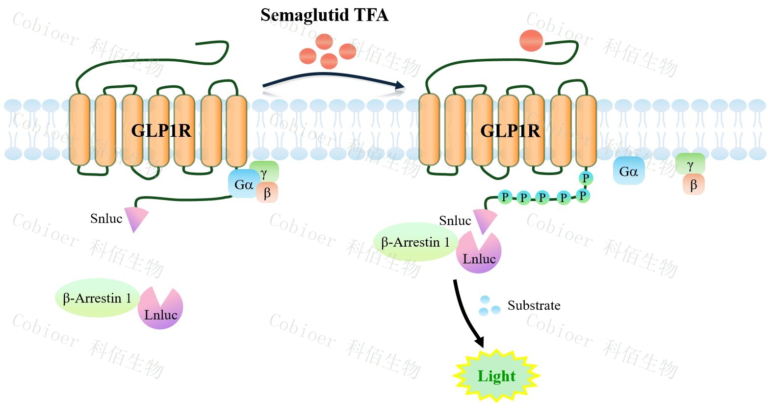 GLP1R β-Arrestin 1 CHO 報(bào)告基因藥靶模型很好的模擬了體內(nèi) GLP1R/β-Arrestin 1 的信 號(hào)轉(zhuǎn)導(dǎo)過(guò)程,原理見下圖所示。當(dāng)缺乏配體刺激時(shí),β-Arrestin 1 不與 GLP1R 結(jié)合,融合β- Arrestin 1 的熒光素酶處于失活構(gòu)象,當(dāng) GLP1R 遭遇配體刺激時(shí),融合熒光素酶報(bào)告基因 的β-Arrestin 1 被招募,使熒光素酶報(bào)告基因處于激活狀態(tài),加入其底物后發(fā)光信號(hào)增強(qiáng)。![]() Figure 1. GLP1R β-Arrestin 1 CHO 細(xì)胞模型原理圖 |