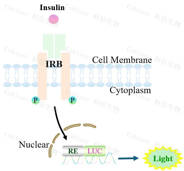 IRB Effector Reporter Cell 報(bào)告基因藥靶模型很好的模擬了體內(nèi) Insulin 的信號(hào)轉(zhuǎn)導(dǎo)過程, 原理見下圖所示。