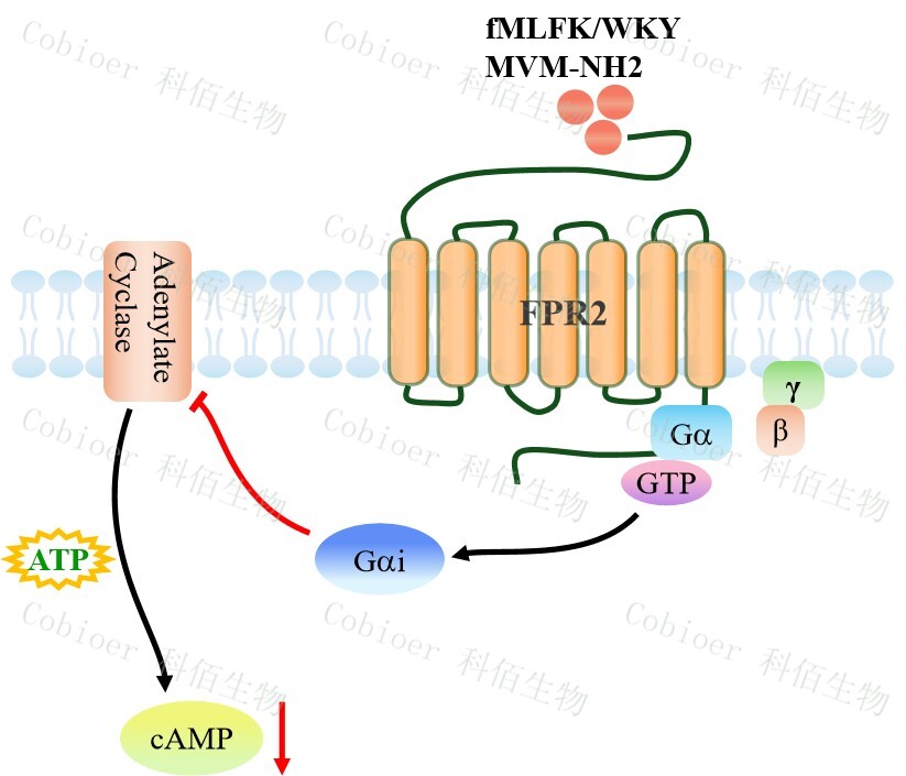 cAMP 在 G 蛋白偶聯受體(GPCR)信號轉導中是一種關鍵的第二信使。當配體結合 到 GPCR,構象發生變化,激活受體接著激活 G 蛋白,Gi 的激活導致腺苷酸環化酶調控 cAMP 的下調。FPR2 CHO 藥靶模型很好的模擬了體內 FPR2 的信號轉導過程,原理見下圖 所示。![]() Figure 1. FPR2 CHO 細胞模型原理圖