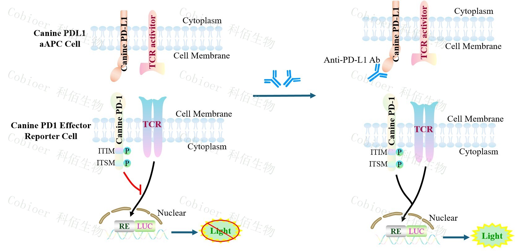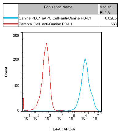 Canine PDL1 aAPC Cell 作為 Canine PD1 Effector Reporter Cell 的靶細胞,Canine PDL1 aAPC Cell 藥靶模型很好的模擬了體內 PD1&PDL1 的信號轉導過程,原理見下圖所示。![]() Figure 1. Canine PDL1 aAPC Cell 細胞模型原理圖 |