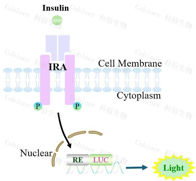 IRA Effector Reporter Cell 報告基因藥靶模型很好的模擬了體內 Insulin 的信號轉導過程, 原理見下圖所示。![]() Figure 1. IRA Effector Reporter Cell 細胞模型原理圖 |
