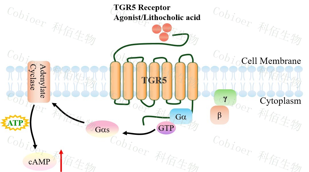 | TGR5 受體是第一個已知的膽汁酸特異性 G 蛋白偶聯受體,也被稱為膽汁酸受體 1(GPBAR1),屬于 A 類 GPCR 亞家族。該受體由七個跨膜螺旋(TMH1-7)、三個胞外環 (ECL1-3)組成,有助于配體結合,以及三個胞內環(ICL1-3),參與將信號傳遞給下游 信號分子。TGR5 在體內廣泛存在,在膽囊、回腸、結腸、棕色脂肪組織、脾臟、肺、骨 骼肌、胰島,肝臟中均有表達。有文獻報道 TGR5 被認為是治療代謝性疾病(如 2 型糖尿 病)的潛在靶點。此外,TGR5 還能降低單核細胞中促炎細胞因子的水平,在炎癥過程 (包括結腸炎和動脈粥樣硬化)中發揮核心作用的病理調節。 | |