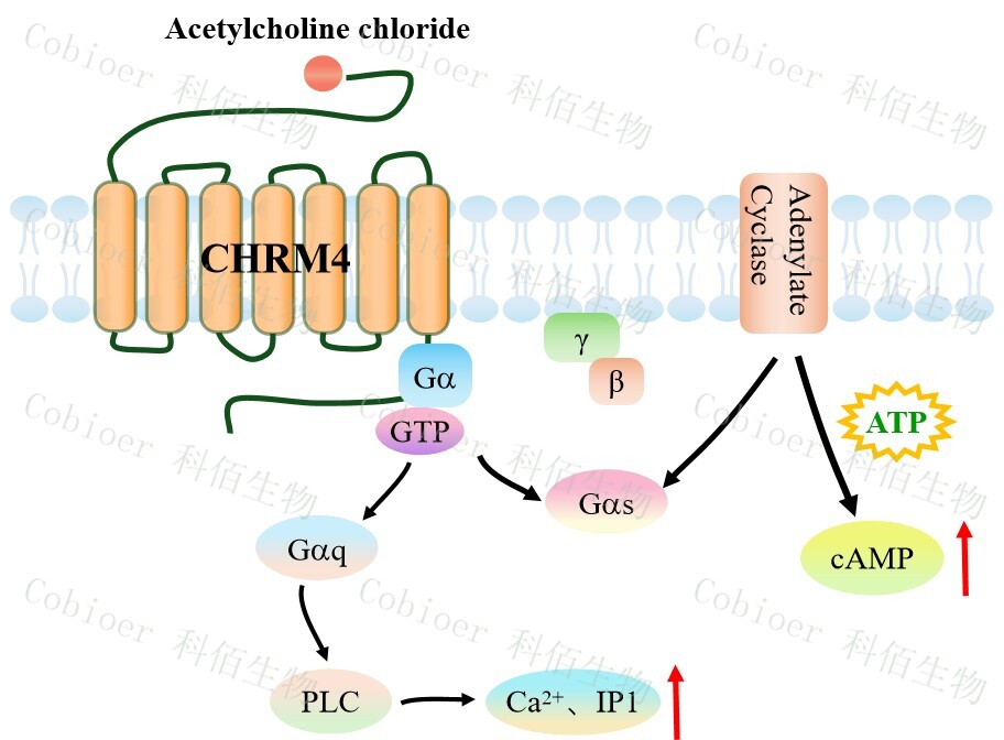 | 毒蕈堿乙酰膽堿受體(MAChRs,簡稱 M 受體)參與中樞神經系統的運動控制、體溫 調節、心血管調節和記憶,介導周圍神經系統的平滑肌收縮、腺體分泌和心率、調節心肌 收縮力。CHRM4 作為 Gi/o 偶聯型毒蕈堿受體,中樞神經系統高表達,其內源性配體乙酰 膽堿(ACh)激活后優先通過 Gi/oα亞基抑制腺苷酸環化酶,同時釋放 Gβγ二聚體。 | |