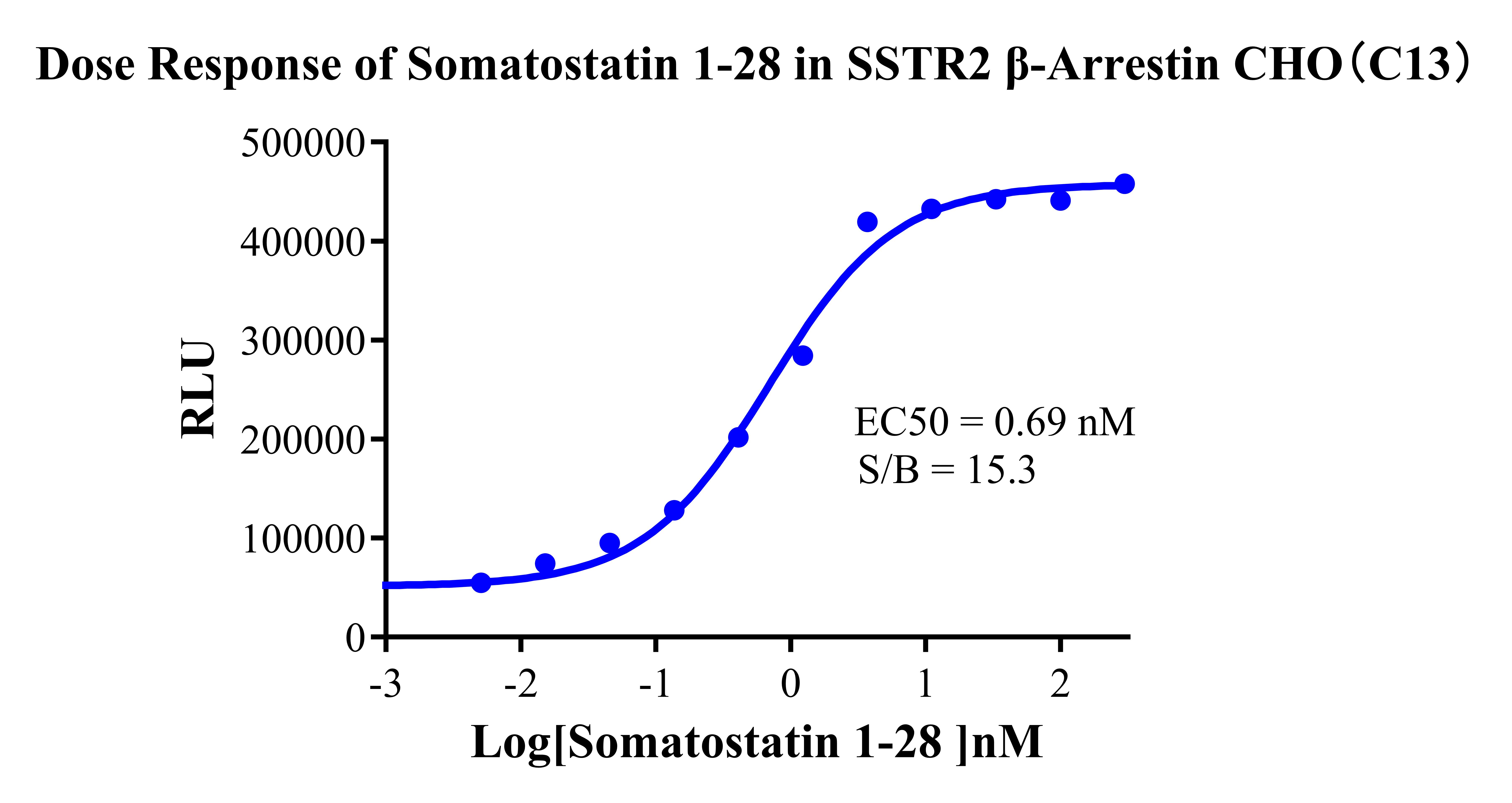 SSTR2 β-Arrestin CHO 報告基因藥靶模型很好的模擬了體內 SSTR2/β-Arrestin 的信號 轉導過程,原理見下圖所示。當缺乏配體刺激時,β-Arrestin 不與 SSTR2 結合,融合β- Arrestin 的熒光素酶處于失活構象,當 SSTR2 遭遇配體刺激時,融合熒光素酶報告基因的 β-Arrestin 被招募,使熒光素酶報告基因處于激活狀態,加入其底物后發光信號增強。
